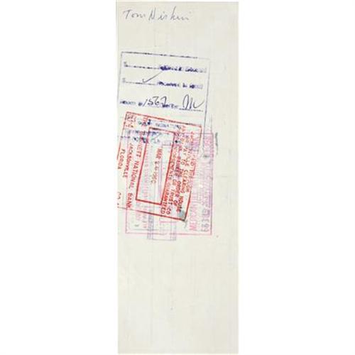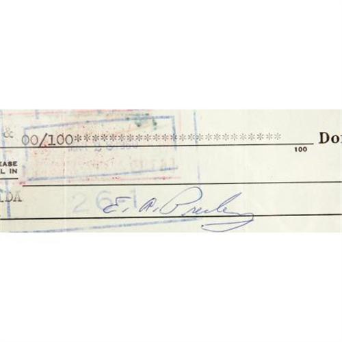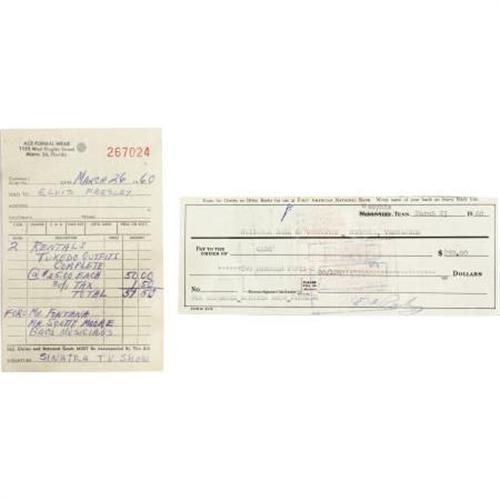 <B>Elvis Presley Signed Check with Receipt.</B></I> A check dated March 23, 1960 for $250 in cash, signed by Presley in blue ink. The memo on the check reads: "Expenses - Sinatra Show - Florida". Also included is a receipt from Ace Formal Wear of Miami dated March 26, 1960, for two tuxedos rented for a total of $51.50. Notations on the receipt indicate the tuxes were for Scotty Moore and D.J. Fontana to wear on the aforementioned TV special, <I>Frank Sinatra's Welcome Home Party for Elvis Presley.</B></I> The items are in Very Fine condition with mild wear and some toning. <I>Accompanied by LOA from PSA/DNA.</B></I><BR><BR><b>Shipping:</b> Flat Material, Small (<a target="_blank" href="http://www.heritageauctions.com/common/shipping.php">view shipping information</a>)