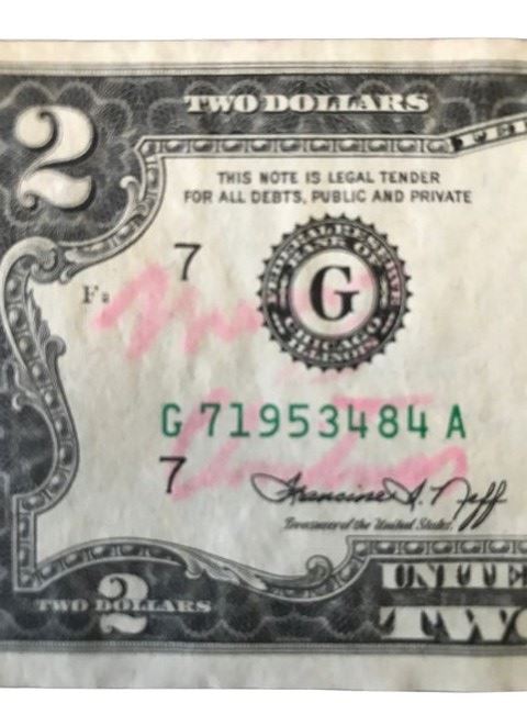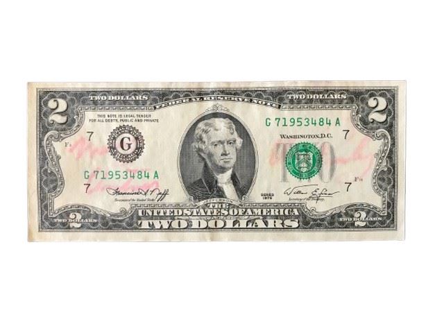 A 1976 Two-Dollar US bill signed by Elvis Presley, part of a private joke to his inside circle, including fellow musician Charlie Hodge. The faded pink marker inscriptions from Elvis read “Merry Christmas” and “Elvis Presley”. Elvis, who was famous for his immense generosity including showering his staff and helpers, and even brand new acquaintances, with valuable gifts up to brand new automobiles, presented his “Memphis Mafia” with crisp and signed two-dollar bills for Christmas in 1976, before giving them more sincere gifts. Elvis found the prank hilarious when his friends were astonished to not (at first) receive gifts worth thousands of dollars for each of them. Sadly, this was to be Elvis’s final Christmas celebration as he passed away the following August. This bill was given to Charlie Hodge on that Christmas. Hodge worked for Presley from 1960 until Presley’s death in 1977, as a member of his “Memphis Mafia”. Hodge was the sole professional musician and entertainer in the group, a background vocalist and rhythm guitarist for Presley, and often handed him water and scarves to use on stage.