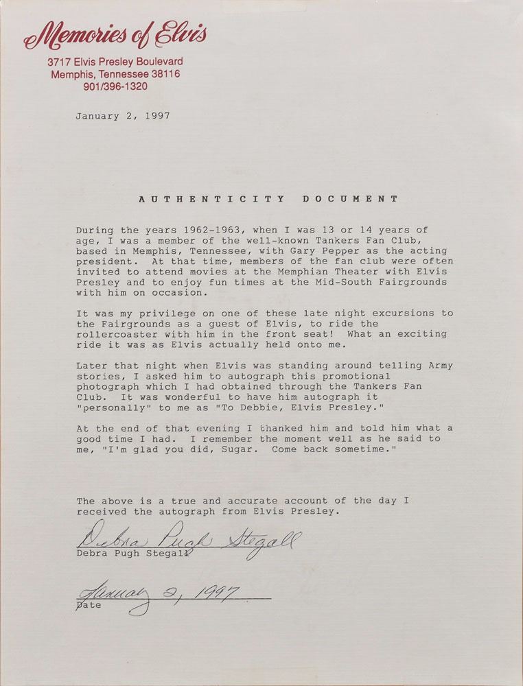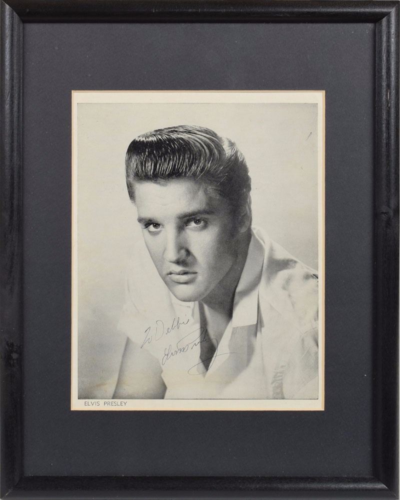 Handsome vintage circa early 1960s 7.5 x 9.5 paperstock fan club photo of Elvis, signed and inscribed in black ballpoint, "To Debbie, Elvis Presley.” Matted and framed to an overall size of 12 x 15. In fine condition, with scattered light creasing, faint toning to the lower portion, and a tiny tear to the left edge. Accompanied by a letter of provenance from the original recipient, in part: "During the years 1962–1963, when I was 13 or 14 years of age, I was a member of the well-known Tankers Fan Club…At that time, members of the fan club were often invited to attend movies at the Memphian Theater with Elvis Presley and to enjoy fun times at the Mid-South Fairgrounds with him on occasion. It was my privilege on one of these late night excursions to the Fairgrounds as a guest of Elvis, to ride the rollercoaster with him in the front seat! What an exciting ride it was as Elvis actually held onto me. Later that night when Elvis was standing around telling Army stories, I asked him to autograph this promotional photograph."