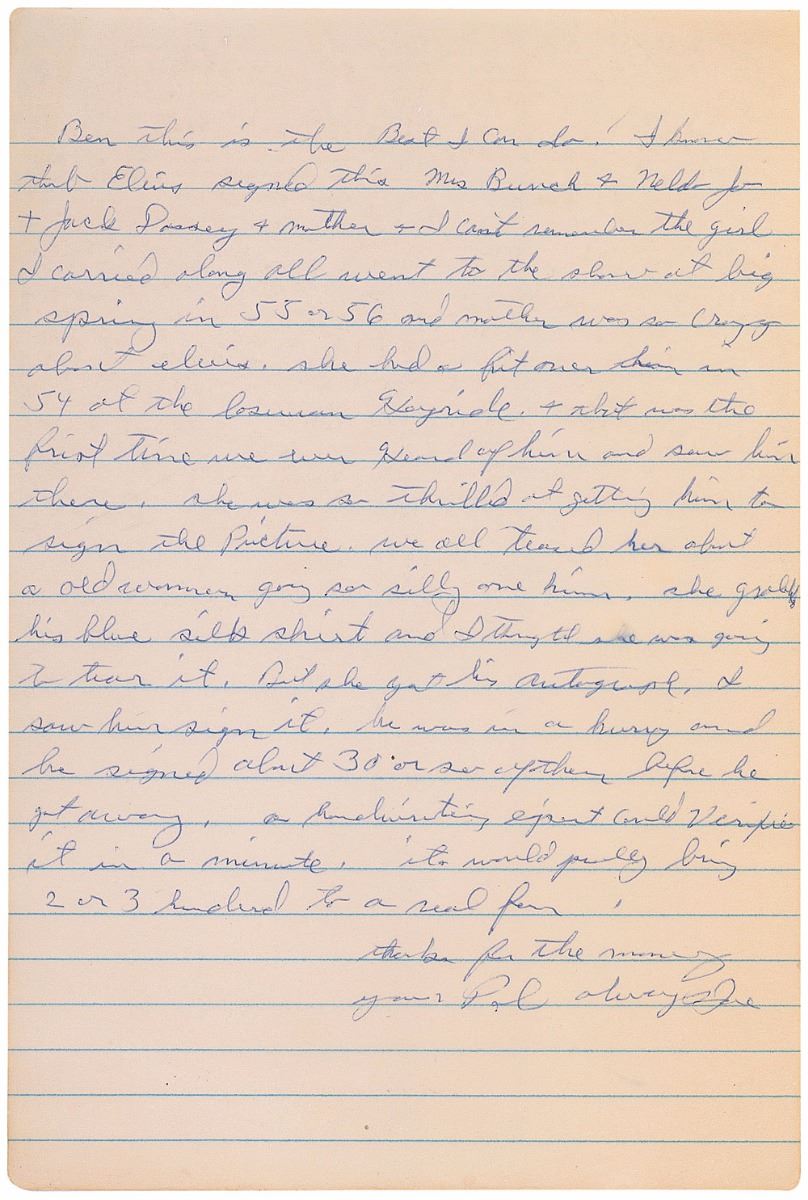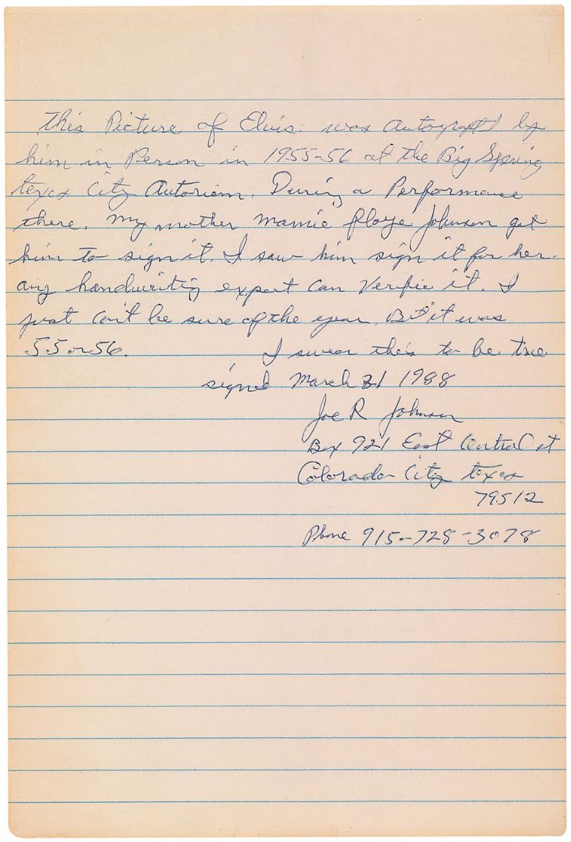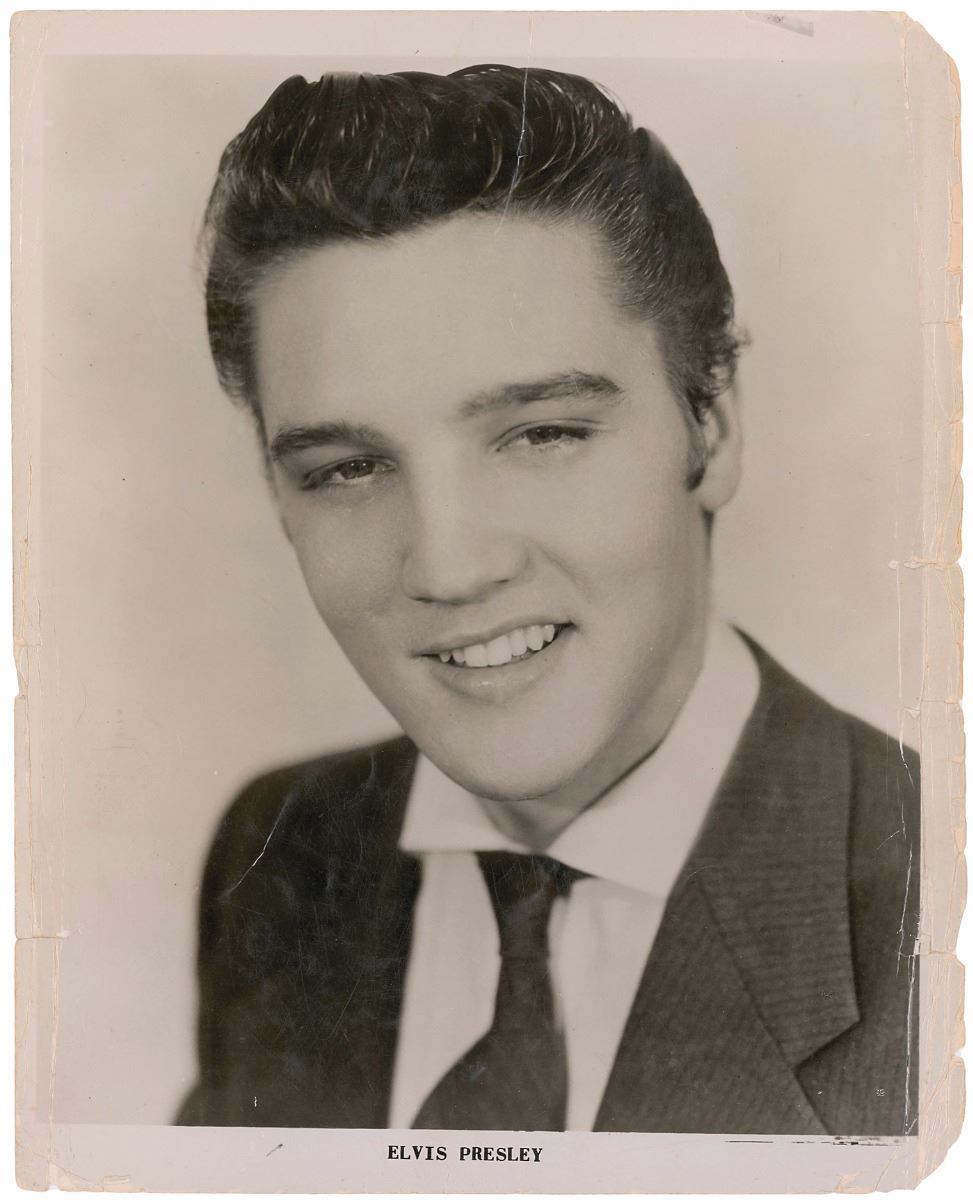 Vintage glossy 7.5 x 9.25 portrait of a young Presley in a suit and tie, signed on the reverse in blue ballpoint, “Yours, Elvis Presley.” In very good condition, with scattered creases and surface marks to image side, heavier to edges as well as several small horizontal edge tears, some scattered light silvering and some light toning and creasing to reverse; signature largely unaffected by flaws to photo. Accompanied by two letters of provenance from the son of the original recipient; the letter dated March 31, 1988, in part: “This picture of Elvis was autographed by him in person in 1955-56 at the Big Spring Texas City auditorium. During a performance there. My mother Mamie Floyd Johnson got him to sign it. I saw him sign it for her.” A desirable signature obtained not long before Presley would become a household name.