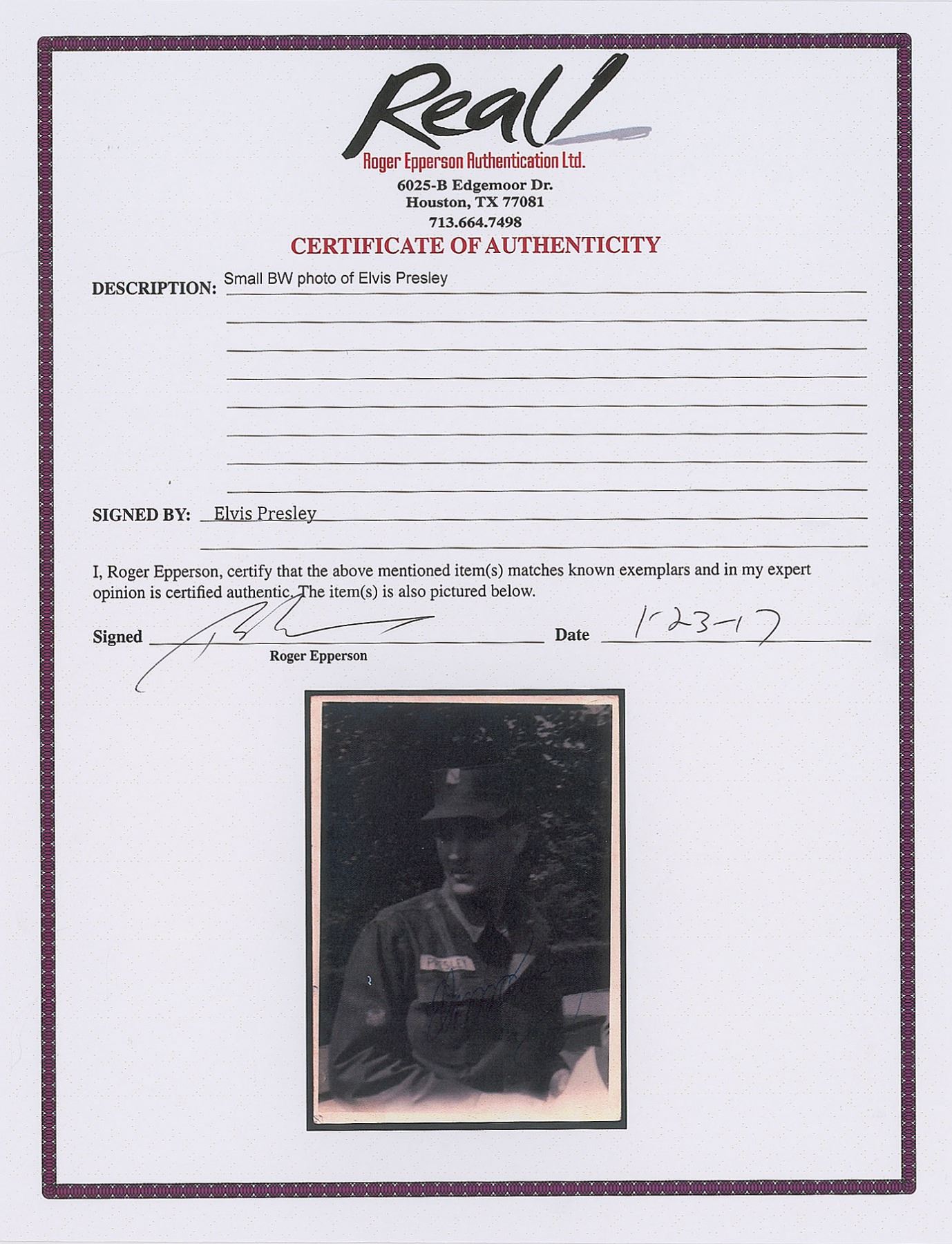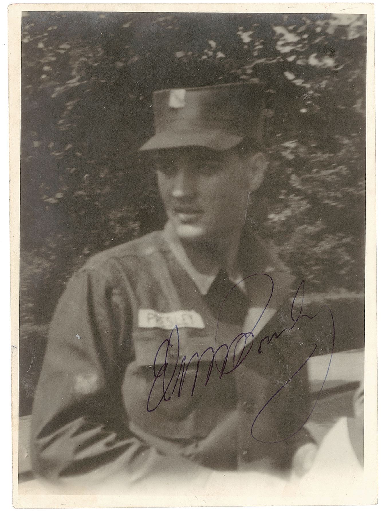 Vintage glossy 3.5 x 3.5 candid photo of Presley in his US Army uniform, crisply signed on the reverse in blue ballpoint, "Elvis Presley." In fine condition, with surface impressions to the photo from the signature on the back. Presley served in the US Army from March 1958 to March 1960, rising to the rank of sergeant and serving in West Germany.