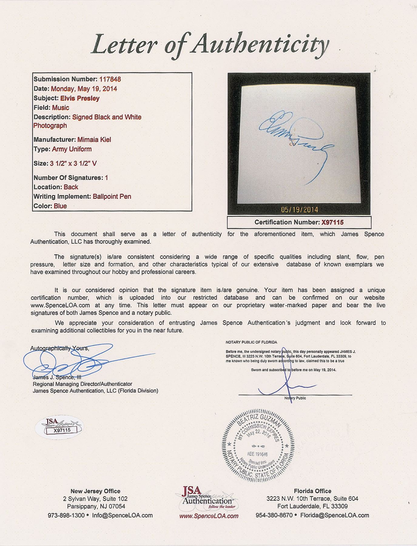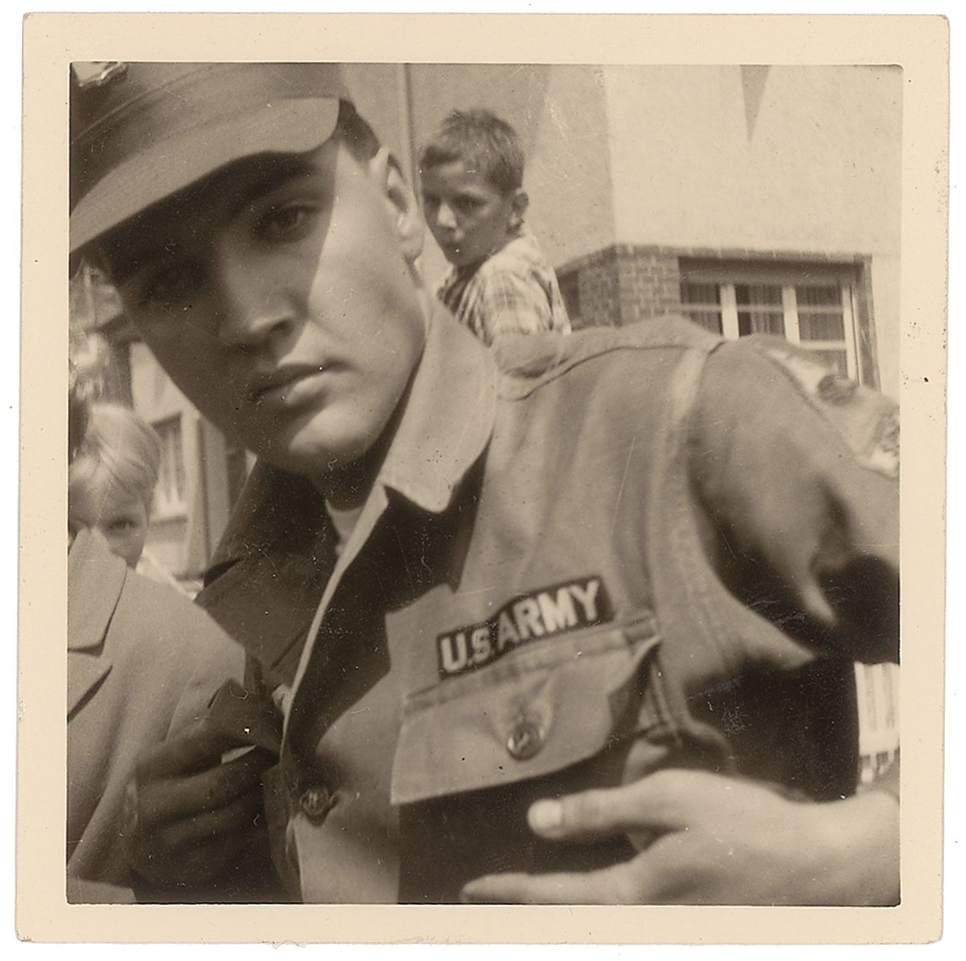 Fantastic vintage glossy 7 x 9.5 photo of Elvis Presley in his US Army uniform, prominently signed in blue ballpoint. In very good to fine condition, with light overall silvering. Accompanied by a full letter of authenticity from REAL. Presley served in the US Army from March 1958 to March 1960, rising to the rank of sergeant and serving in West Germany.