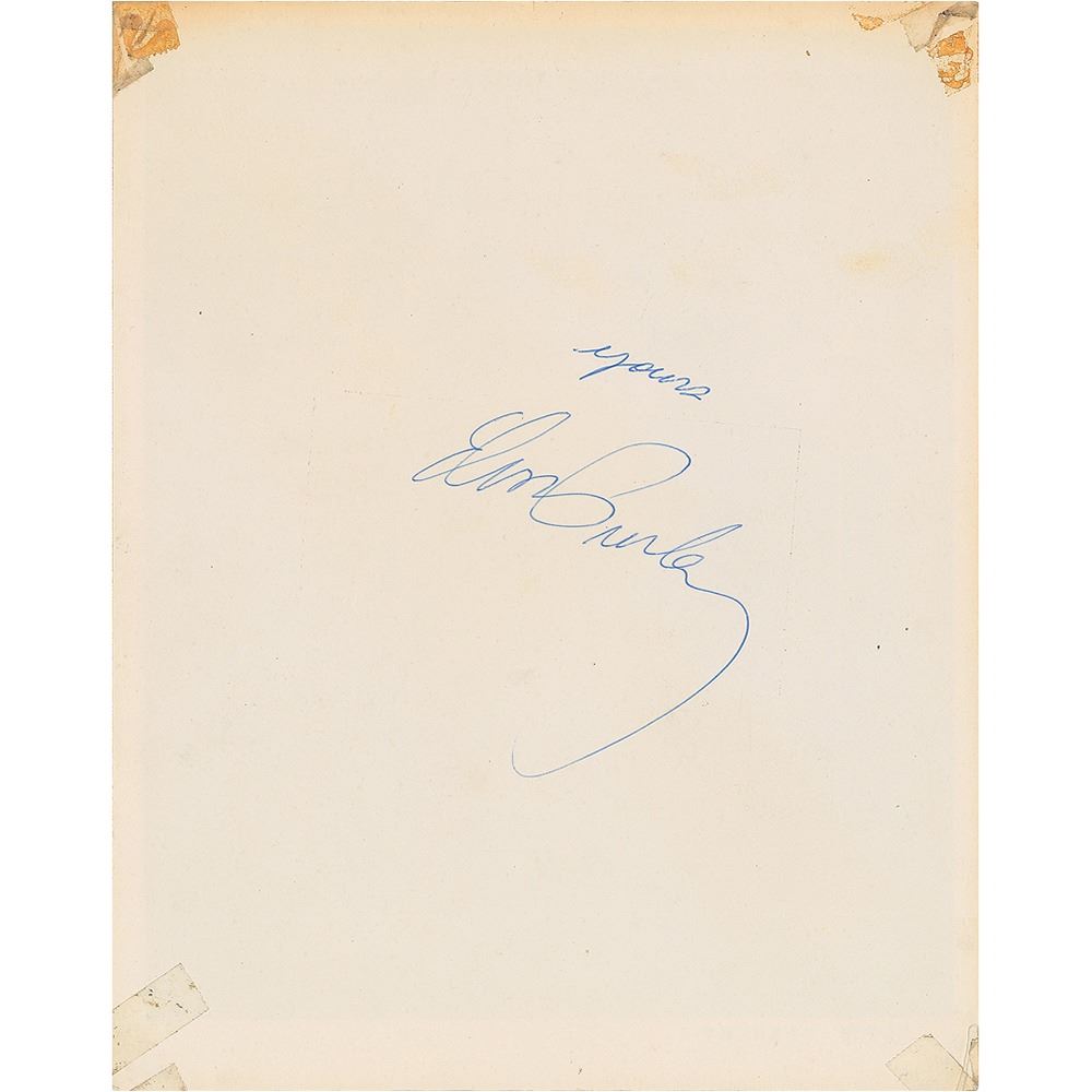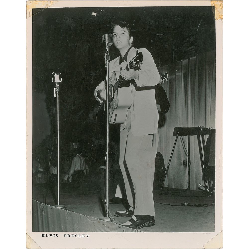 Very desirable vintage glossy 8 x 10 publicity photo of Presley playing on stage in a full-length pose, signed on the reverse in blue ballpoint, "Yours, Elvis Presley." In very good to fine condition, with scattered light creasing, and old tape remnants to all four corners; the signature area is clean and unaffected.