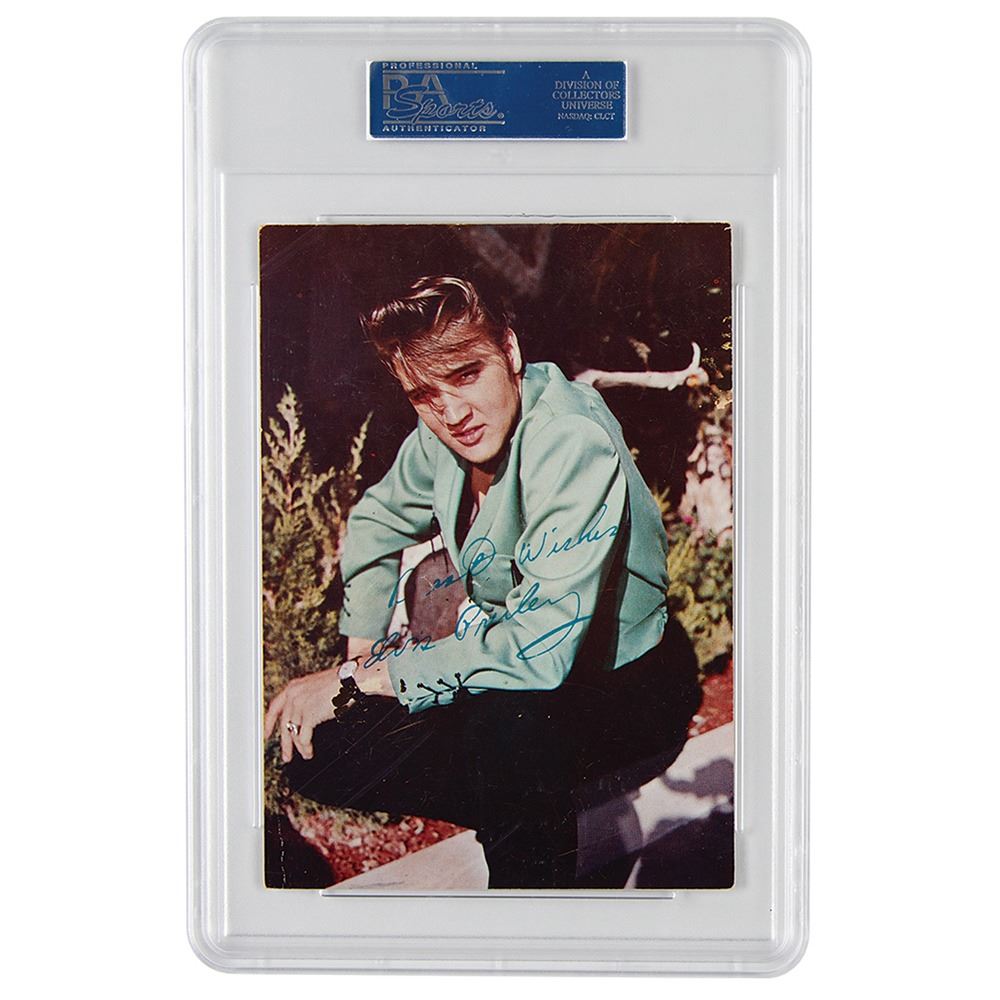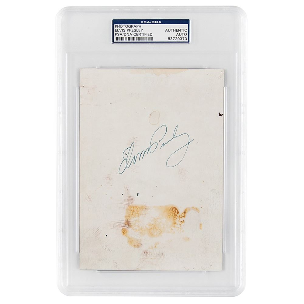 Uncommon color semi-glossy 5 x 7 promotional photo of Elvis Presley seated outdoors with his long bangs falling over his eyes, signed on the reverse in fountain pen. The front bears a preprinted facsimile autograph. In very good to fine condition, with staining to the signed side. Encapsulated in a PSA/DNA authentication holder.