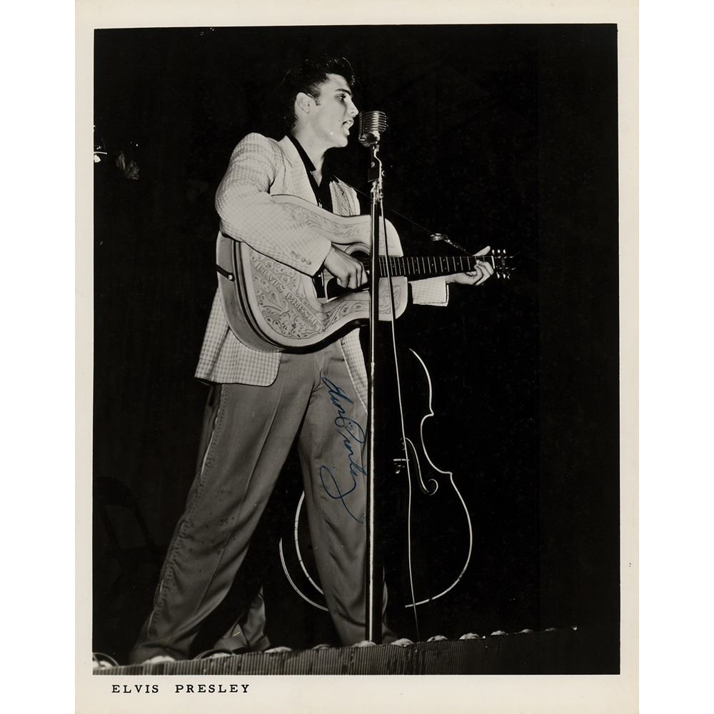 Spectacular vintage matte-finish 8 x 10 full-length photo of Elvis Presley performing on stage with his acoustic guitar, signed along his pant leg in fountain pen. In very good to fine condition, with overall tiny surface scuffs, and light silvering to the perimeter. An early and uncommon pose from the 'King of Rock 'n' Roll.'