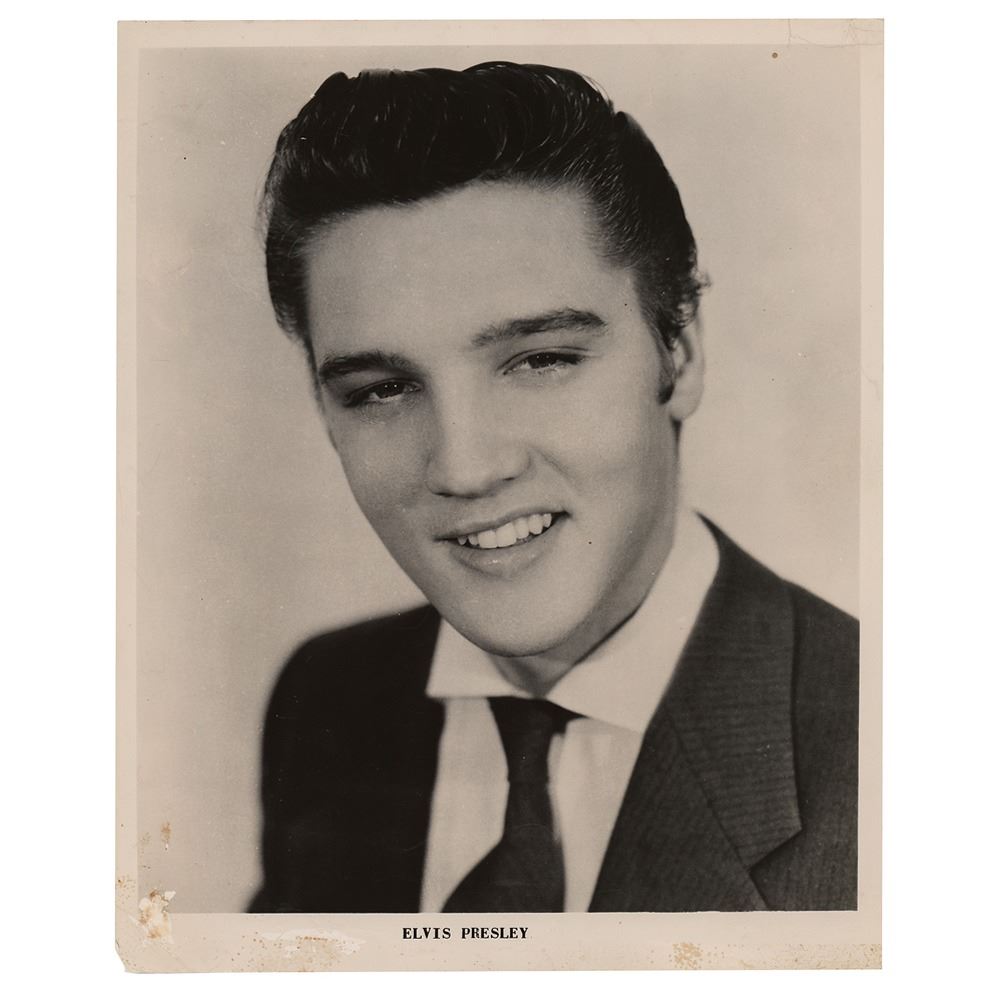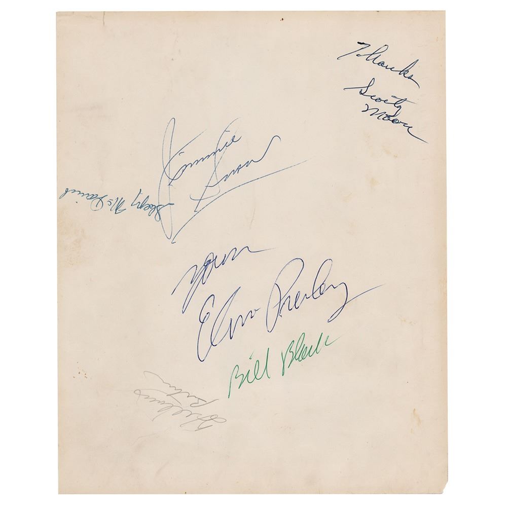 Fabulous vintage glossy 8 x 10 promo photo of Elvis Presley, signed on the reverse in ballpoint by Elvis and other members of the 1955 Tillman Franks tour: "Yours, Elvis Presley," "Thanks, Scotty Moore," "Bill Black," "Jimmie Swan," and "Sleepy McDaniel." In very good condition, with a short tear to the top edge, and overall creasing (more evident on the photo side, which also has some emulsion loss to the lower left corner, and surface impressions from the signatures on the back). The consignor notes that the autographs were obtained in person by his mother-in-law, on January 5, 1955, in San Angelo, Texas. Moore and Black were part of Elvis's early trio—known as The Blue Moon Boys—while the others were members of the Tillman Franks tour, which Elvis's band was supporting.