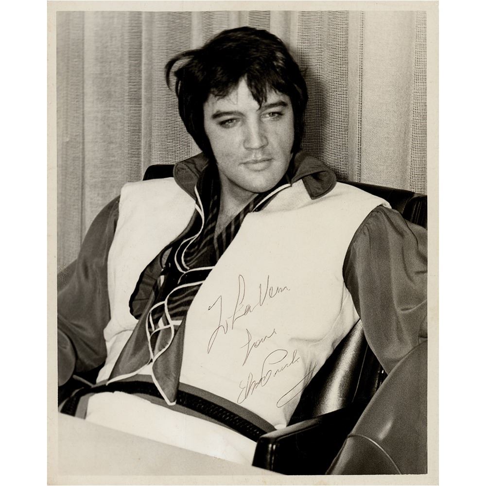 Vintage glossy 8 x 10 photo of Elvis in a classic outfit—white vest and open silk shirt—neatly signed and inscribed in black ballpoint, "To LaVern, from Elvis Presley.†Professionally rebacked and restored to very good to fine condition, with smoothed creases (including a vertical crease to the left of his face).