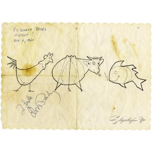<B>Elvis Presley Signed Place Mat.</B></I> This 14" x 10" paper place mat from a restaurant in Meacham Airport in Fort Worth, Texas, is inscribed "To Leslie" and signed by Elvis in blue ink. It also bears the notation "Ft. Worth, Texas Airport, Nov 6, 1960" in an unknown hand. November 6, 1960 was the day Elvis flew from Graceland to California to start filming on his seventh feature film, <I>Wild in the Country.</B></I> No doubt some lucky fan encountered Presley during a stopover and was able to obtain this autograph. The mat is in Fine condition with mild wear, moderate soiling and areas of discoloration, and heavy fold creases, none of which overtly affects the signature. A curious piece of Presleyana. <I>Accompanied by LOA from PSA/DNA.</B></I><BR><BR><b>Shipping:</b> Flat Material, Small (<a target="_blank" href="http://www.heritageauctions.com/common/shipping.php">view shipping information</a>)