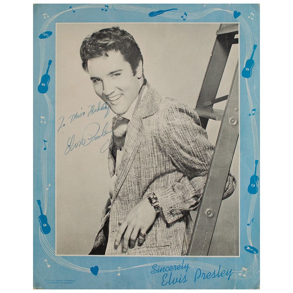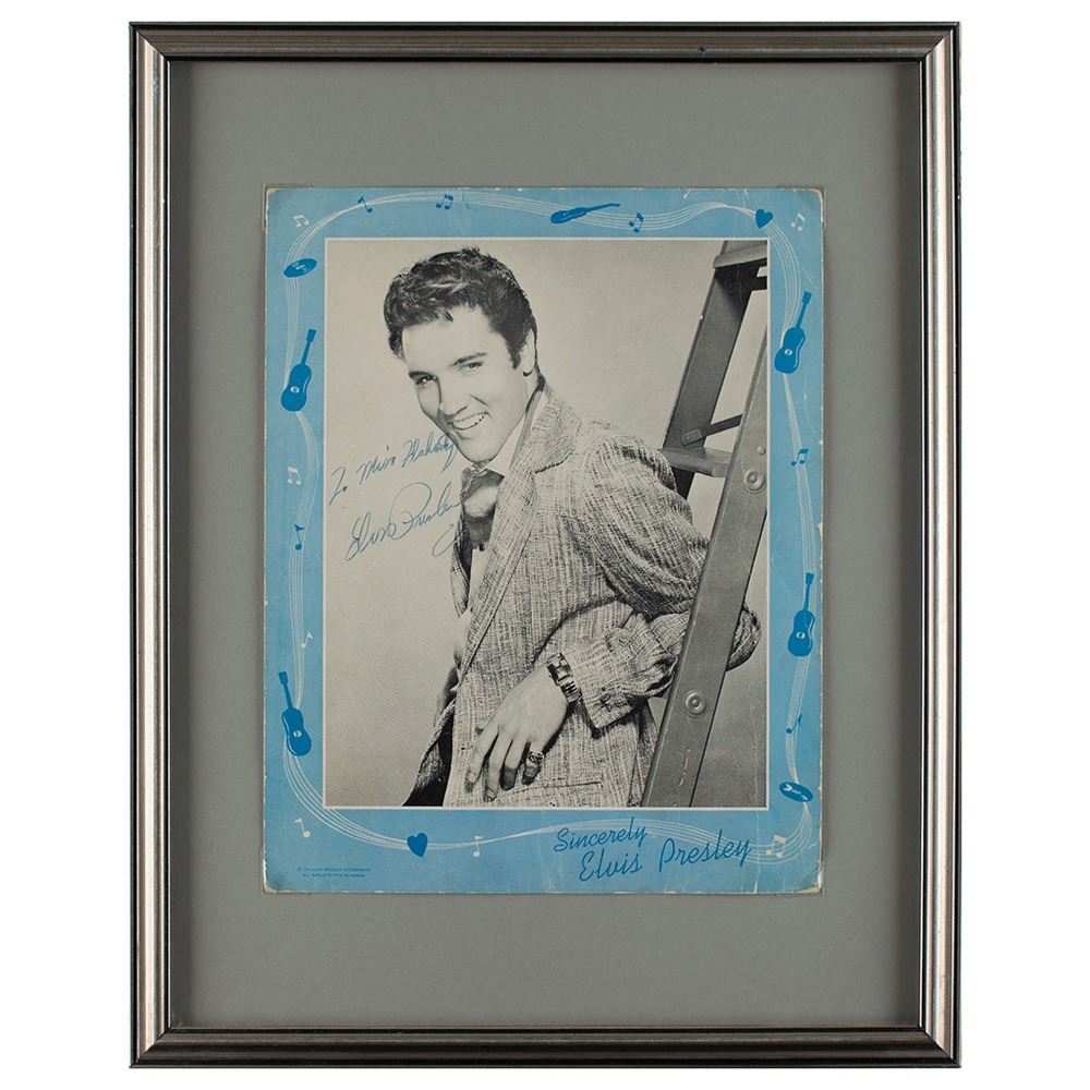 Vintage cover for an Elvis Presley souvenir program from circa 1957, 8 x 10, which shows Presley smiling and leaning on a ladder, signed and inscribed in fountain pen, "To Miss Flaherty, Elvis Presley." Mounted and framed to an overall size of 12 x 15. In fine condition, with light creasing in the borders.