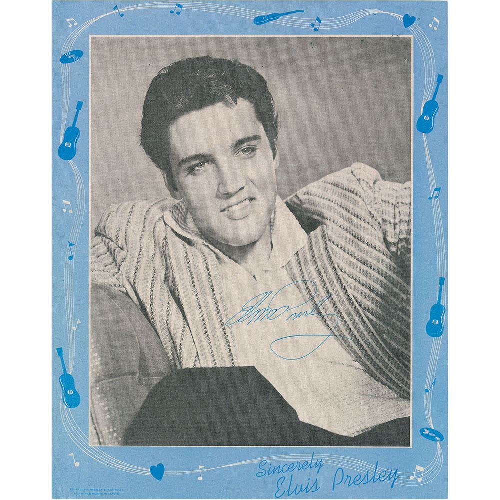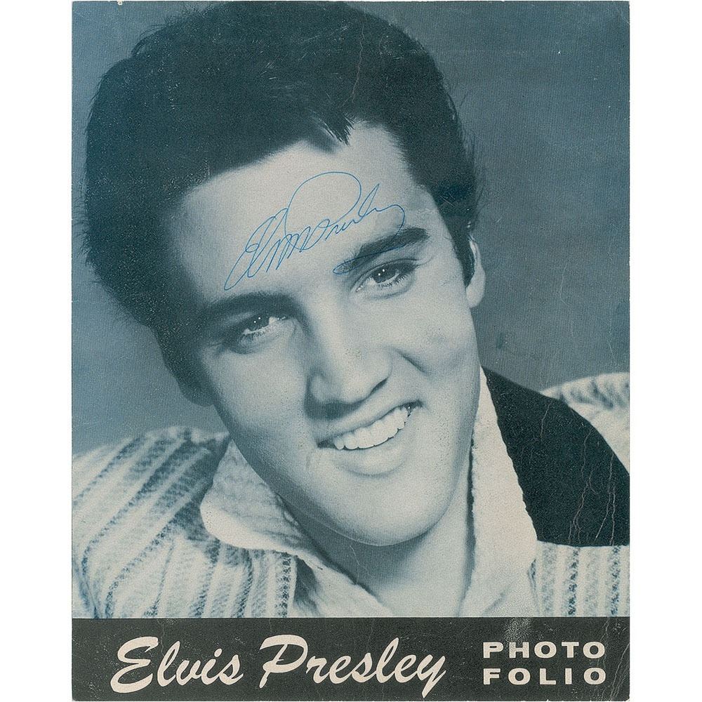 Exceptional vintage 7.75 x 9.75 double-sided program cover from the 1957 Elvis Presley photo folio, signed on both sides in blue ballpoint. In very good to fine condition, with some light creasing, and scattered adhesive residue on the "Photo Folio" side. A wonderful uninscribed example with a pair of bold signatures. Accompanied by a full letter of authenticity from REAL.