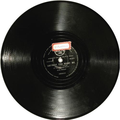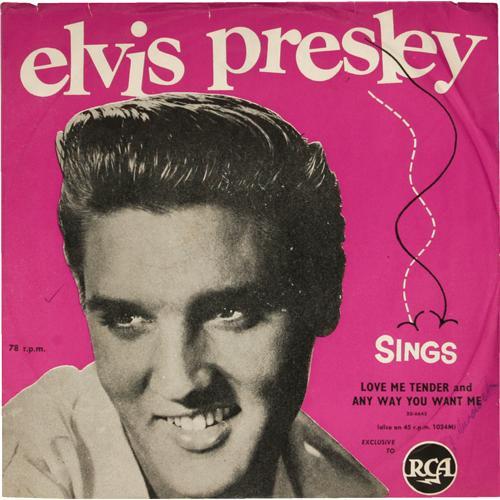 <B>Elvis Presley "Love Me Tender" RCA 78 with Picture Sleeve (New Zealand, RCA 6643, 1956 or 1957).</B></I> This striking picture sleeve from New Zealand is quite rare, and both the sleeve and disc are in very nice condition. The four-digit record number and the backing side "Any Way You Want Me" are the same as the US version, but the sleeve is unique to the New Zealand version. Condition: EX 7/ EX 7. <I>From the GRT Collection.</B></I><BR><BR><b>Shipping:</b> Recordings (<a target="_blank" href="http://www.heritageauctions.com/common/shipping.php">view shipping information</a>)