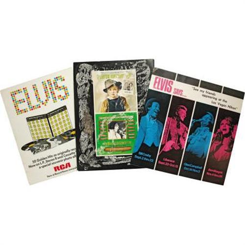 <B>Elvis Presley Souvenir Menu Group of 3 (1971-75).</B></I> Three sensational souvenir menus from Elvis' legendary Las Vegas engagements of the '70s. The earliest is from 1970 and features a full beautiful, textured black and white photo-front menu measuring 8.5" x 11". Inside it touts the "SUMMER FESTIVAL" at the International Hotel. The back has an ad for Elvis' "Worldwide 50 Gold Award Hits, Vol. 1", a four record set. The second menu is from 1971, with a full-photo black and white Elvis in front of a multi-colored "ELVIS" neon effect. The menu measures 9" x 12", and the back has an ad for the "ELVIS COUNTRY" album. The third menu is an 11" x 11" menu from the Las Vegas Hilton with a full-color Elvis photo on the front and previews of coming attractions on the back -- Bill Cosby, Liberace, Glen Campbell, and Ann-Margret. Elvis' engagement in 1975 was cut short by illness after five performances in three days. All are in NM- condition.<BR><BR><b>Shipping:</b> Flat Material, Small (<a target="_blank" href="http://www.heritageauctions.com/common/shipping.php">view shipping information</a>)