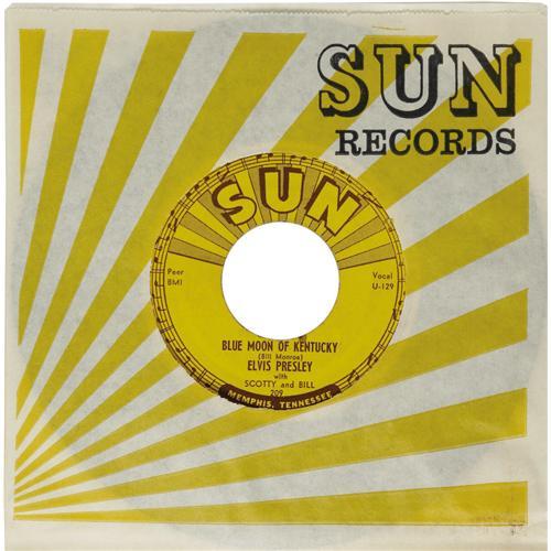<B>Elvis Presley "That's All Right" 45 Sun 209 (1954).</B></I> It's always a thrill seeing Elvis' first Sun recording -- certainly one of the great events in Rock 'n Roll history. B/w "Blue Moon Of Kentucky," the classic Bill Monroe tune -- the combo saying a lot about Elvis' influences. One side Bluegrass, the other Arthur Crudup-penned R&B. Condition: VG-EX 6.