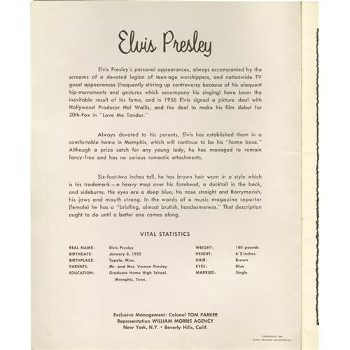 <B>Elvis Presley Tour Book and Photo Books.</B></I> Included is a copy of Elvis 1956 souvenir tour book, plus two copies of his 1957 photo folio. In overall Very Fine condition with some light wear.<BR><BR><b>Shipping:</b> Flat Material, Small (<a target="_blank" href="http://www.heritageauctions.com/common/shipping.php">view shipping information</a>)