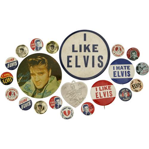 <B>Elvis Presley Vintage Charm and Assortment of Pinback Buttons.</B></I> Includes a heart-shaped Elvis charm, a 3.5" "I Like Elvis" pinback, a 3" Elvis photo pinback, matching 1.5" "I Like Elvis/I Hate Elvis" pinbacks, and 16 assorted 1" pinbacks. In overall Very Fine condition with mild wear.<BR><BR><b>Shipping:</b> Flatware (<a target="_blank" href="http://www.heritageauctions.com/common/shipping.php">view shipping information</a>)