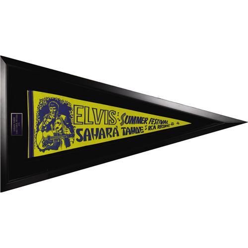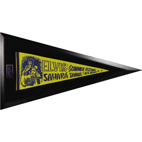 <B>Elvis Presley Sahara Tahoe Pennant in Unique Triangle Frame (1971).</B></I> A blue and yellow 29" x 12" felt pennant advertising Elvis' appearance at the Sahara Tahoe in Lake Tahoe, Nevada. It's mounted on black velvet and framed beautifully to an overall size of 44.5" x 24". In Excellent condition with mild wear.<BR><BR><b>Shipping:</b> Framed - with Glass, Large (<a target="_blank" href="http://www.heritageauctions.com/common/shipping.php">view shipping information</a>)