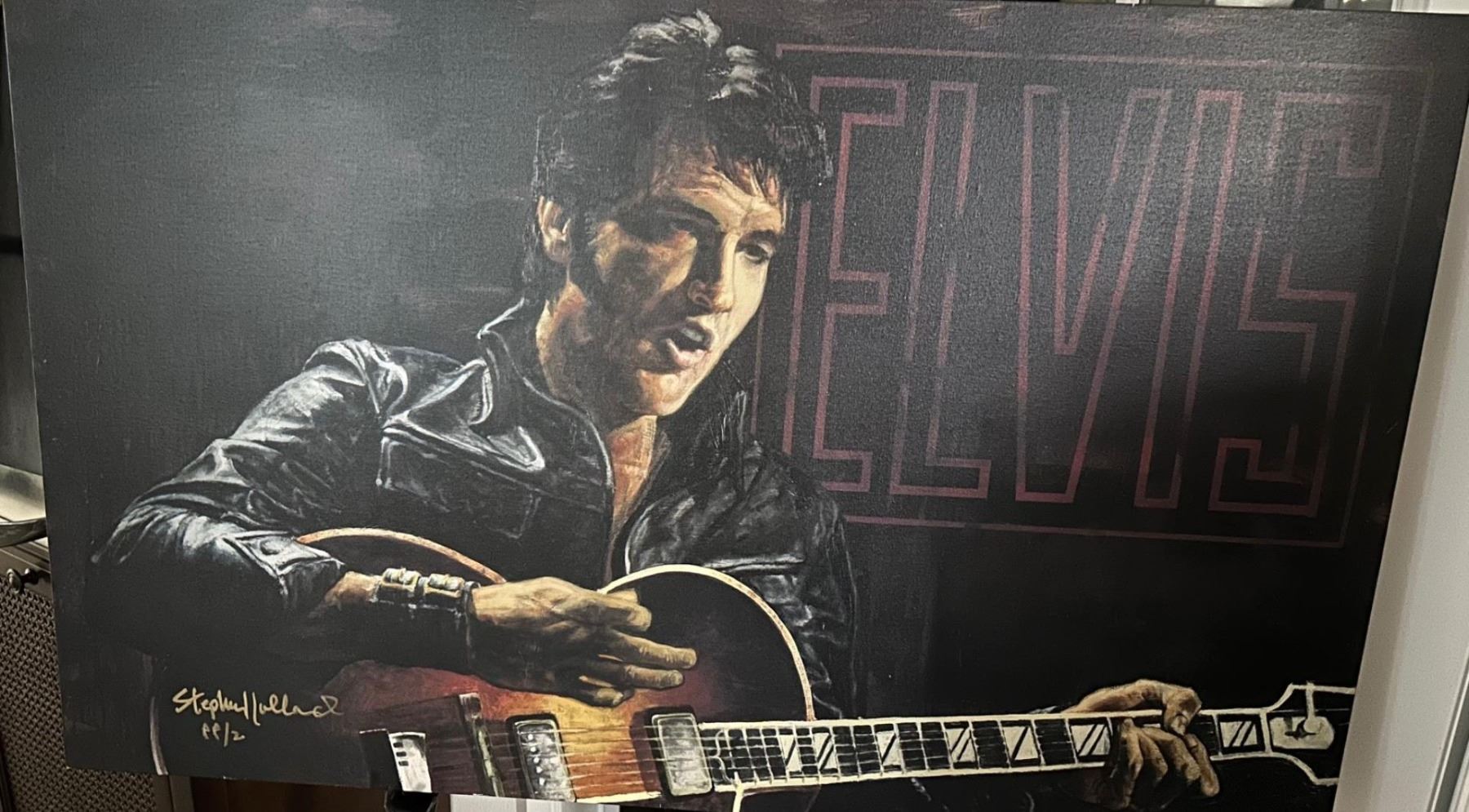 Elvis Presley 25.5" x 42" Giclee PP2, by Stephen Holland on boxed canvas. Was exhibited so some slight wear on edges. w/COA