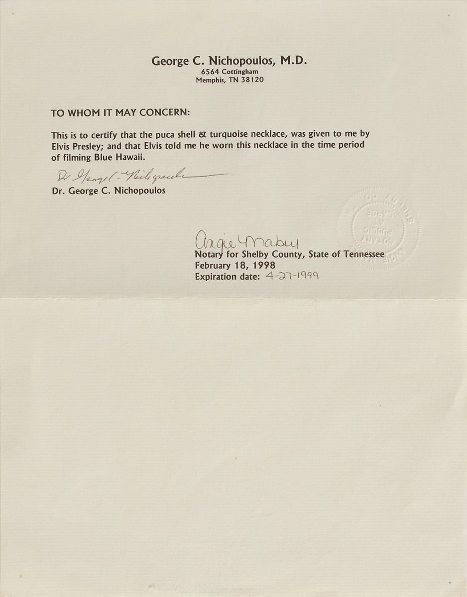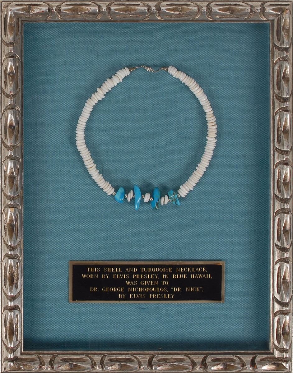 Elvis Presley’s vintage Puka seashell and turquoise necklace, measuring 5.5? in diameter, worn by Presley during production of the 1961 film Blue Hawaii. Mounted and framed with a detached plaque to an overall size of 11.75 x 15.25. In fine condition. Accompanied by a letter of provenance from the original recipient, Dr. George Nichopoulous, in full: “This is to certify that the puca shell & turquoise necklace, was given to me by Elvis Presley; and that Elvis told me he worn [sic] this necklace in the time period of filming Blue Hawaii.” The first of three films Presley shot in Hawaii, Blue Hawaii was followed by 1962’s Girls! Girls! Girls! and 1965’s Paradise, Hawaiian Style. The 26-year-old Presley arrived in Hawaii on March 18, 1961, nearly a month before the film’s location shooting, to rehearse for a March 25 charity concert raising funds for the Arizona Memorial at Pearl Harbor. A uniquely wonderful piece of history relating to the King and his well-documented adoration for the Hawaiian islands.