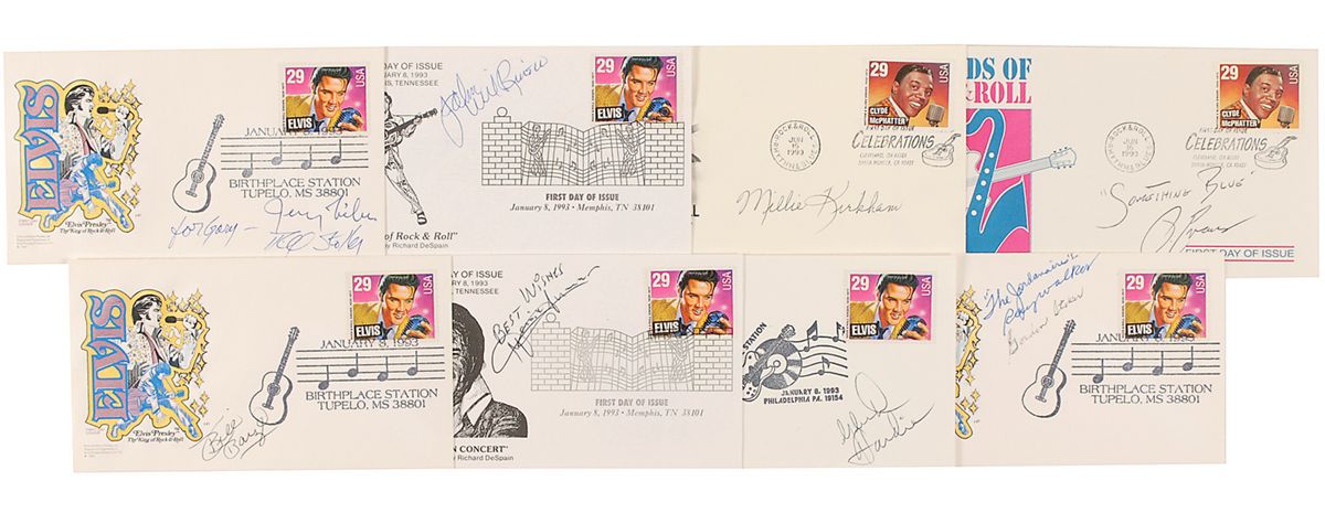 Collection of eight FDCs and commemorative covers, each signed in ink by a former musician or songwriter who worked with Presley. Signers are: Leiber and Stoller (ins), John Williamson, Bill Baize, Donnie Sumner, Glen Hardin, Ray Walker and Gordon Stoker, Paul Evans, and Millie Kirkham. In fine condition.