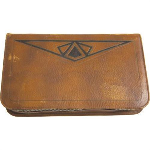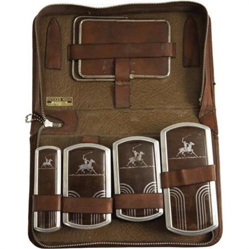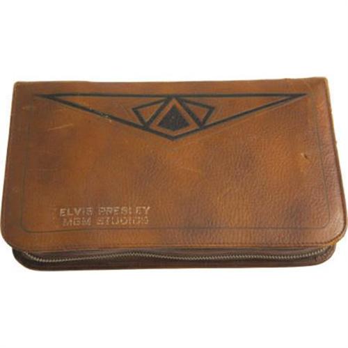 <B>Elvis Presley's Personal Grooming Set.</B></I> This brown leather case with "Elvis Presley MGM Studios" embossed on the front unzips to reveal a small shaving mirror, a brush, and three stainless steel cases for holding various toiletries (one of which still contains a piece of shaving soap and a small mustache brush). In Very Fine condition with some mild wear and one loop that has partially separated. <I>From the Ann Sothern Collection.</B></I> <I> Accompanied by COA from L.A. Prop and Wardrobe Co.</B></I><BR><BR><b>Shipping:</b> Miscellaneous Collectibles, Larg (<a target="_blank" href="http://www.heritageauctions.com/common/shipping.php">view shipping information</a>)