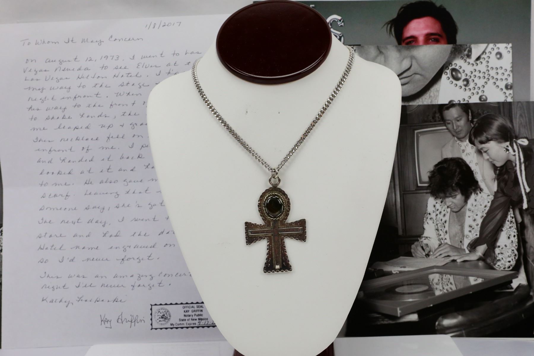 Elvis Presley's Personally Owned Stage Worn Ankh Necklace Worn in Las Vegas on August 12, 1973 W/Notarized Letter of Provenance, Photos & Magazine - This silver toned ankh necklace was personally owned and worn by Elvis Presley. The necklace was worn by Elvis at the Las Vegas Hilton Hotel on August 12, 1973, where he performed a midnight show. When Elvis took the stage that night he made his way to the front of the stage to greet his fans, he bend down to shake hands and the necklace fell to the ground and was picked up by a fan seated in the front row. She returned the necklace to Elvis, who then gave the necklace back to her along with a silk scarf. She had this piece engraved on the back the next day with Elvis' name, the date "8-12-73" and the hotel name "L.V. Hilton" in order to never forget the day. This special, stage worn piece will be accompanied by a notarized letter of provenance detailing the story of how the piece was acquired, along with several photos of Elvis wearing the necklace in Las Vegas on August 9, 1973 while meeting backstage with famous Japanese music critic and songwriter Reiko Yukawa. The lot will also include an issue of The Elvis Files Magazine which features an article about Elvis' meeting with Yukawa. The ankh pendant measures approx. 2.75" x 1.75", and hangs on a 26" chain. According to our seller, this piece was made by Mike McGregor, a blacksmith and leather craftsman who met Elvis in the 1960s at the Western shop where Mike worked crafting saddles. Elvis hired Mike to work at the Circle G Ranch taking care of the horses. Mike and his family lived at Circle G and then moved to Graceland, where he continued making leather goods and jewelry for Elvis until he left Graceland to open his own jewelry shop in Mississippi in 1976.