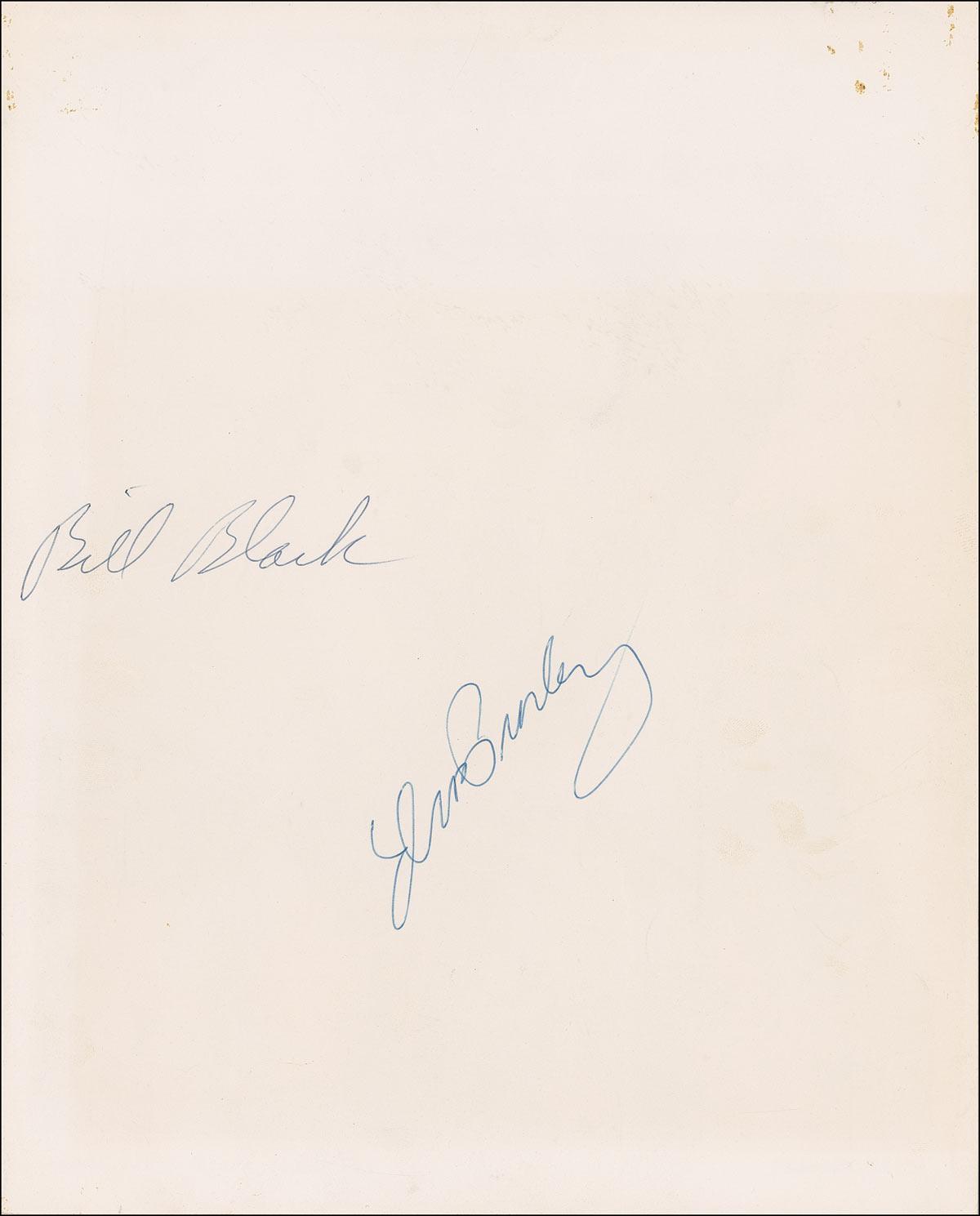 Vintage glossy 8 x 10 photo, signed on the reverse in blue ballpoint, “Elvis Presley,” and also signed in ballpoint by his bass player Bill Black. In very good to fine condition, with some scattered light creases and toning to reverse, as well as a bit of trivial foxing to top right, and surface impressions and creases to image side. Accompanied by a short handwritten note from Black on a scrap of paper reading “Early Elvis, ‘My picture is to [sic] pretty to write on’ From St. Louis concert, Elvis’s Trio, Bill Black.” A nicely signed early example, with Black perhaps shedding light on Presley’s penchant for signing the backs of his photos.