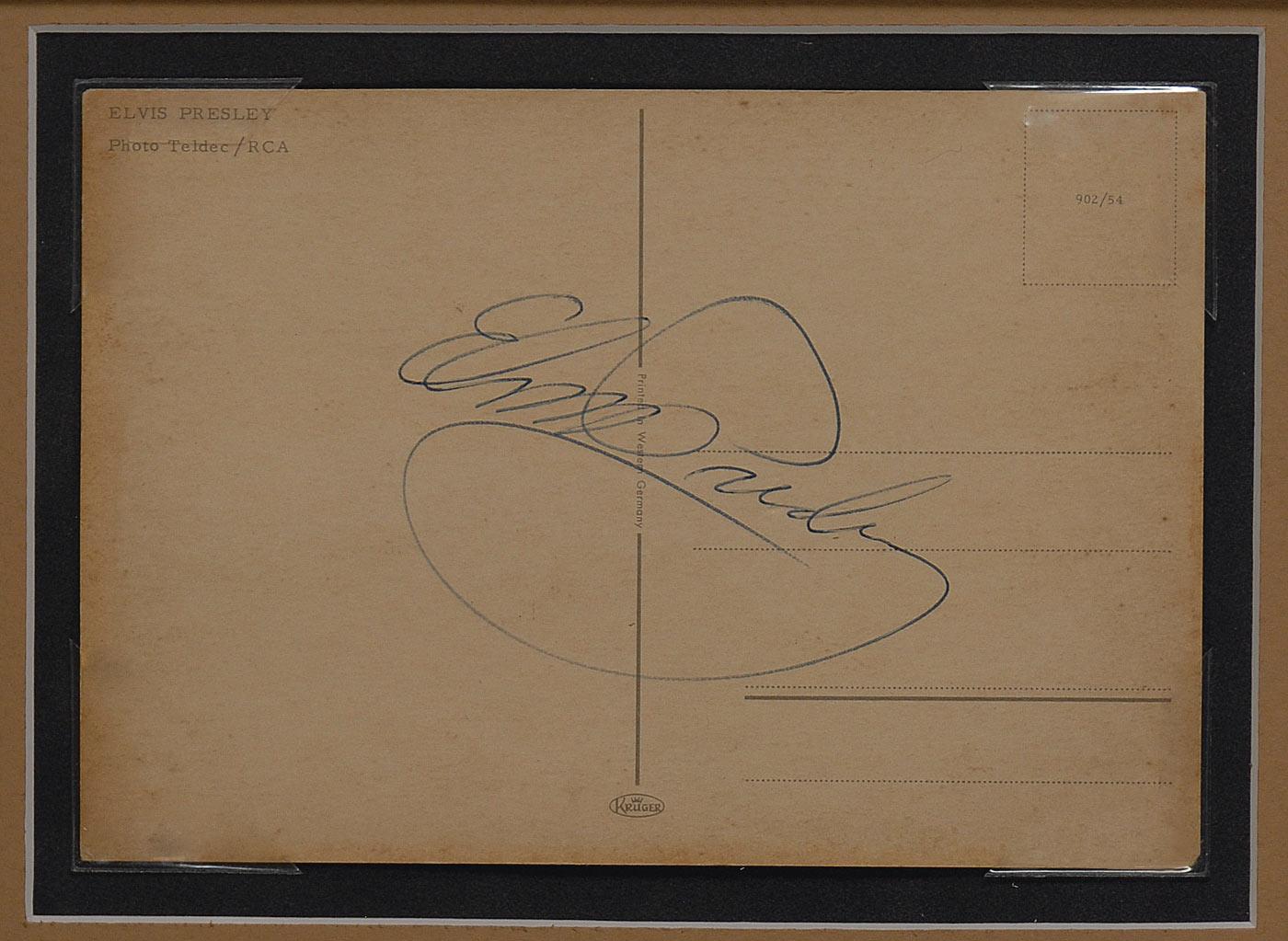 Ink signature, “Elvis Presley,” on an off-white 3.5 x 5.5 postcard. Elaborately double suede matted with an original souvenir photo album, original fan button, 78 RPM vinyl recording of ‘Love Me Tender,’ and lettering “Elvis 1956” and framed to an overall size of 36.5 x 22.5. In fine condition, with edge toning and some light soiling. Oversized.