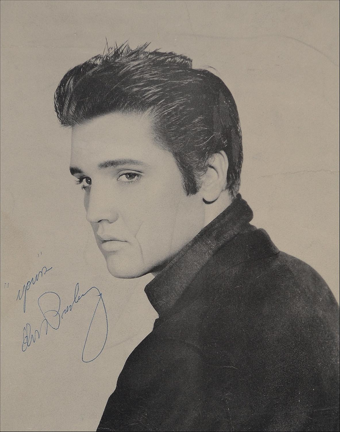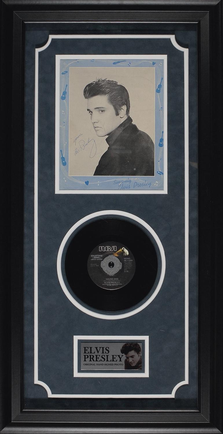 Vintage 7.5 x 9.5 portrait of Elvis looking over his shoulder and featuring a color border of hearts, records, and musical notes, likely taken from sheet music or a program, signed in blue ballpoint, “’Yours’, Elvis Presley.” Double suede matted and framed with an RCA 45 rpm single of ‘Hound Dog,’ and a small name plaque, to an overall size of 17 x 32.5. In very good condition, with scattered creases to borders and image (a few lightly affecting Presley’s cheek and a more prominent horizontal crease in right blank area), scattered light soiling and staining to image (including some to facial area), and a small tear to bottom border. A boldly signed early example. Oversized.