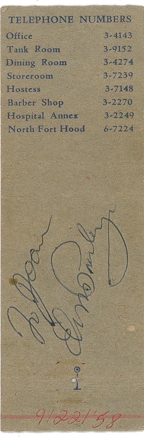 Empty matchbook from the Fort Hood, Texas Officers Open Mess, signed and inscribed inside in ballpoint, “To Joan, Elvis Presley.” Matchbook is dated vertically along the left edge in another hand, “9/22/58.” In fine condition, with expected folds, staple holes next to beginning of signature, and a small spot to inscription.