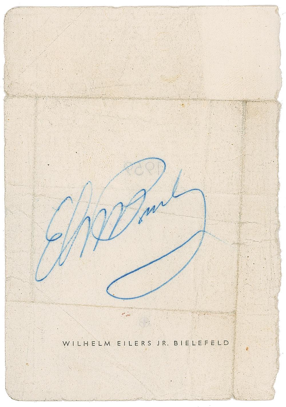 Vintage ballpoint signature, “Elvis Presley,” on an off-white 3 x 4.5 slip. In very good condition, with two noticeable creases passing through his signature, four folds surrounding his name, and show-through from a date printed on the reverse. According to the consignor, Presley’s autograph was obtained on a pocket calendar when the singer was staying in Germany in the early 1960s. The original recipient traded the signature for a friend’s stamp collection, with that young man keeping the signature in a plastic sleeve in his wallet for more than 40 years before parting with it in 2003. Accompanied by a letter of authenticity (in German) from the original seller.
