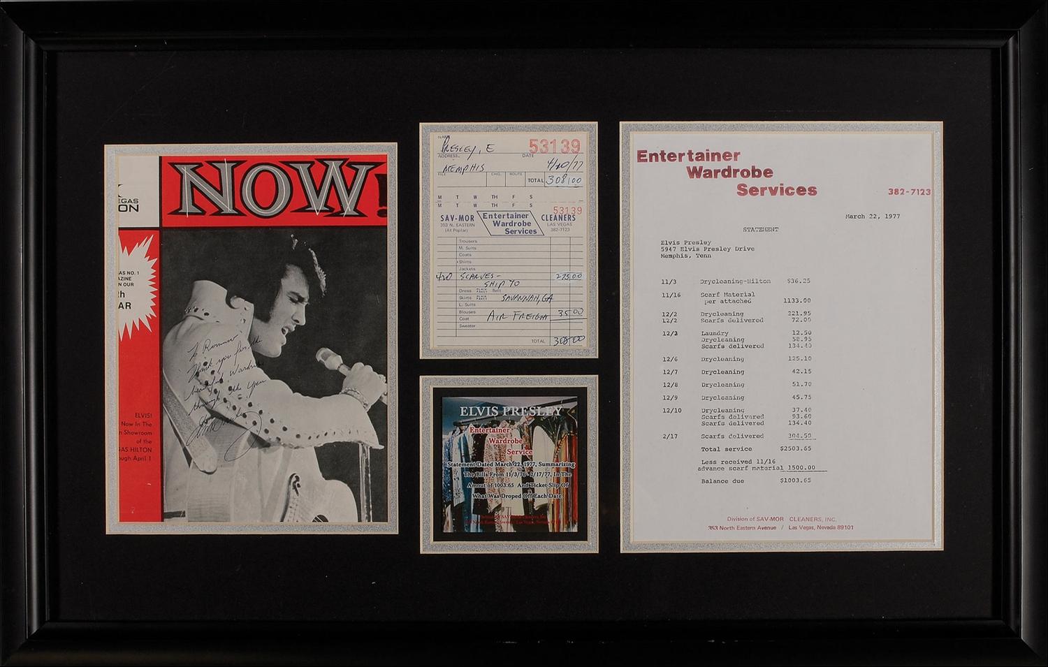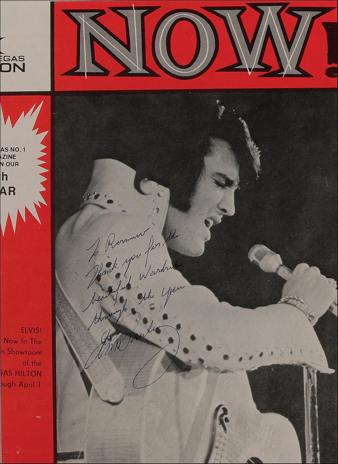 Original vintage Las Vegas Hilton entertainment magazine, 7 x 9.5, boldly signed and inscribed on the front cover in black ballpoint “To Romano, Thank you for the beautiful wardrobe through the years. Elvis Presley.” Double-matted with a receipt from a company that made Elvis scarves and a photocopy of a dry cleaning bill to an overall size of 27.25 x 17.5. In fine condition. The original recipient was Ciro Romano, Elvis’ tailor whom the King referred to by his last name. Romano would measure and tailor outfits for Presley, including his iconic black leather suit for his 1968 comeback special, a task for which Elvis was clearly appreciative.