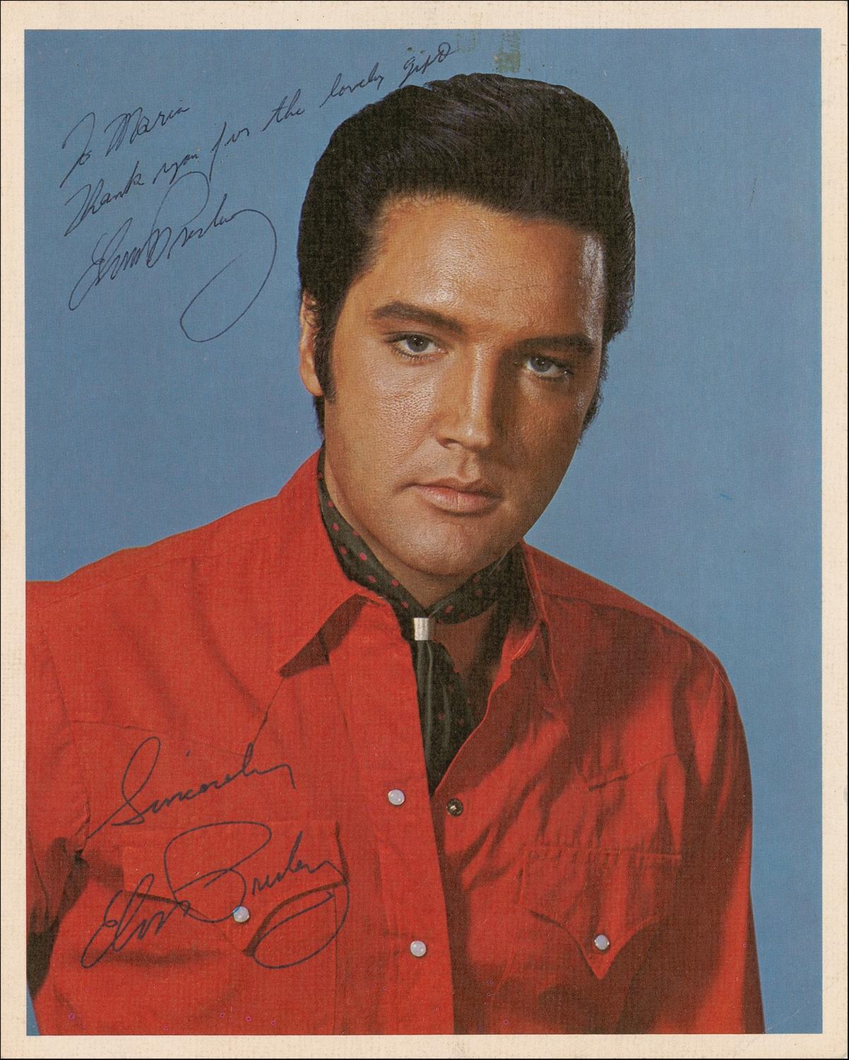 Color vintage 8 x 10 textured cardstock RCA promotional photo, signed and inscribed in black ballpoint “To Maria, Thank you for the lovely gift. Elvis Presley.” In fine condition, with a couple of small creases, corner bumps, small area of adhesive staining above Elvis’ head, and faint edge toning. The reverse bears a listing of Presley’s “long playing albums.” According to the consignor, the photo was issued around the time Elvis returned to live performances and was autographed at the gates of Graceland for a fan who had presented him with a Bible.
