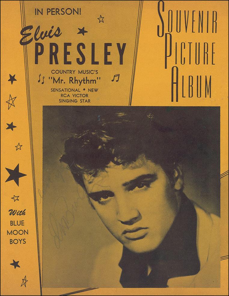 Scarce vintage souvenir picture album, very similar to a concert program, circa 1955-56, 8.5 x 11, eight pages, heralding Presley on the cover as “Country Music’s ‘Mr. Rhythm’ Sensational New RCA Victor Singing Star,” signed on the front cover in pencil, “Love you, Elvis Presley.” A bit of light contrast to Presley’s signature and sentiment, scattered toning and foxing to inside pages, and mild handling wear, otherwise fine condition. These particular programs are difficult to find even unsigned.