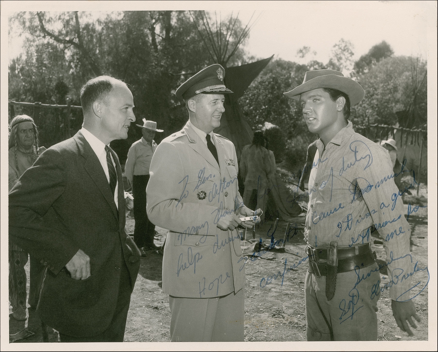 Rare vintage matte-finish 10 x 8 photo of Elvis on the set of Flaming Star speaking with an army general, signed and inscribed in blue ballpoint “To Gen. Clifton, Many thanks for your help during my tour of duty. Hope I didn’t cause too much confusion! It was a good experience for me. Sincerely, Sgt. Elvis Presley.” In fine condition, with small top left corner crease and a faint paperclip impression.