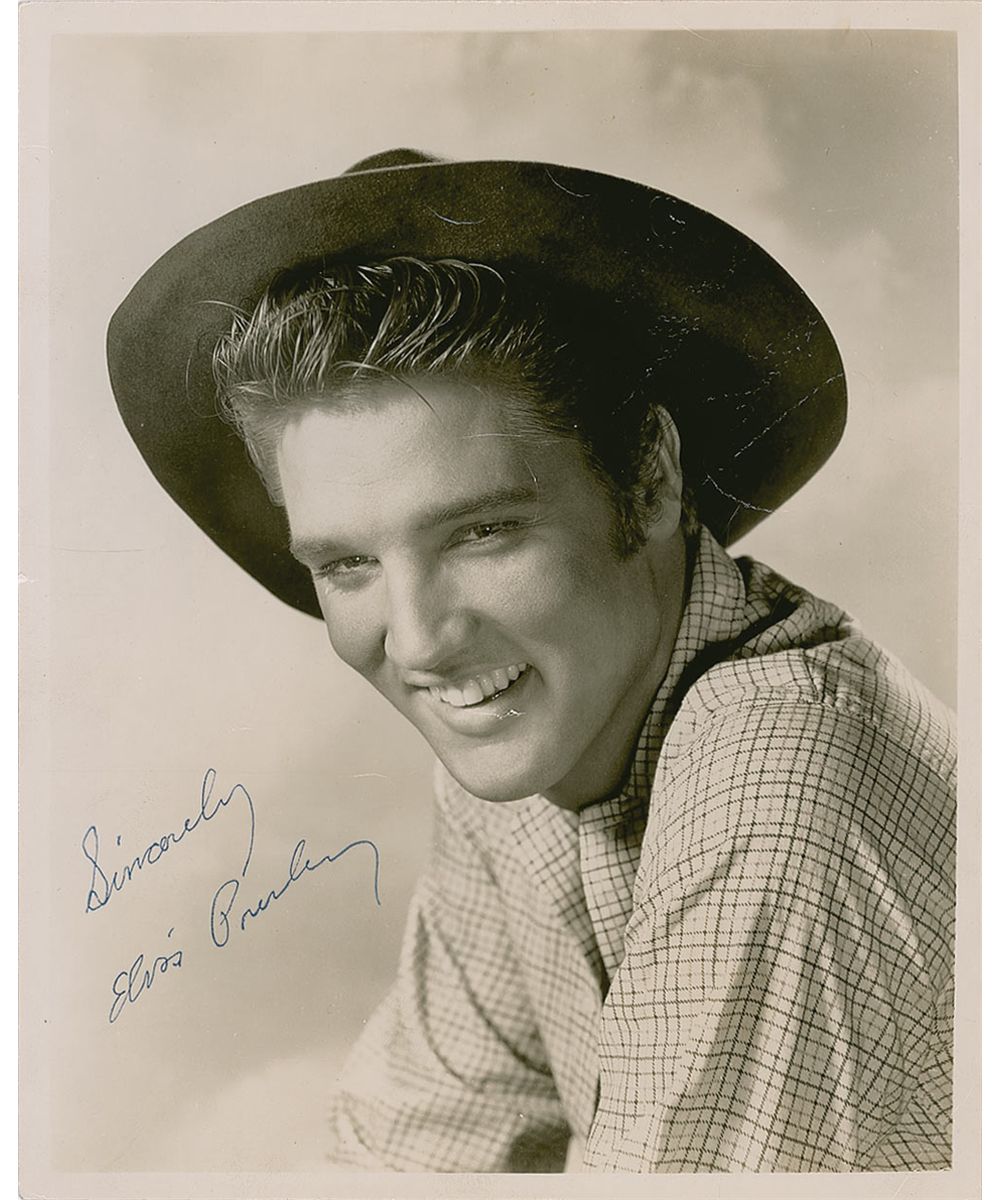 Vintage glossy 8 x 9.75 publicity photo for Love Me Tender, with Elvis in a striped shirt and cowboy hat, and bearing a stamped signature next to the image, signed and inscribed on the reverse in black ballpoint “To De De and Sharon, Elvis Presley.” In very good condition, with moderate noticeable creasing to image side, not quite as evident on reverse, as well as prominent impressions from Presley’s signature and inscription on reverse, and a bit of light spotting to reverse. Accompanied by a letter of provenance from the original recipient, Sharon Bastley, stating, in part: “My father worked as a policeman in St. Louis, Mo. He also worked security at Kiel Auditorium…circa 1955, when Elvis performed there…While on duty at the performance, Dad acquired the glossy photo that I have directly from Elvis…Elvis stayed at the Chase Hotel…Dad had Elvis sign the back of this photo to my sister DeDee and myself.” Presley played the Kiel Auditorium on March 29, 1957, playing to a sold out audience of 11,000 wearing his iconic gold lame suit.