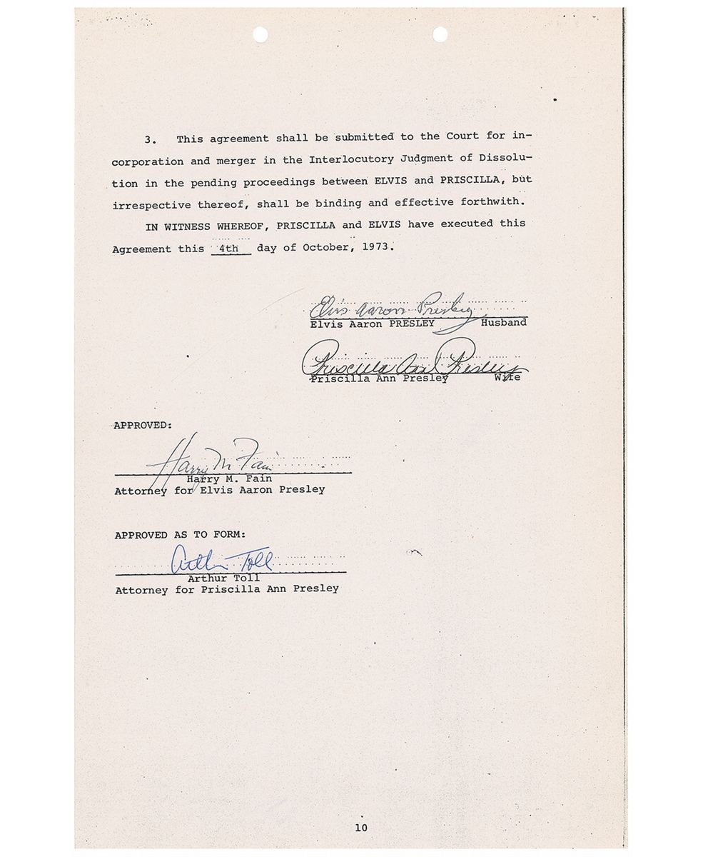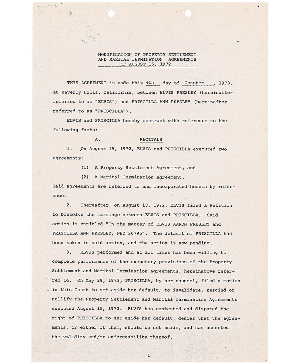 DS, signed “Elvis Aaron Presley,” ten pages, 8.5 x 13, October 4, 1973. Modification of property settlement and marital termination between Elvis and Priscilla Presley detailing arrangements for property settlement, spousal and child support, and child custody. In part: “Elvis shall pay to Priscilla in consideration of property division or settlement…the sum of $725,000 within ten (10) days following the approval of this agreement…the further sum of $725,000 in settlement and discharge of Priscilla’s claims to property payable $6,000, or more, per month…Priscilla is entitled to receive one-half of the net proceeds received by Elvis of and from his intended sale of the residence known and described as 144 Monovale Drive, Los Angeles, California, and the furnishings located therein…Elvis shall transfer, or cause to be issued to Priscilla 5% of the total outstanding stock issued or to be issued for Elvis Presley Music, Inc, and White Haven Music Inc…Elvis shall pay to Priscilla as spousal support, the sum of $4200.00 per month…until the death of either party, the remarriage of Priscilla, or twelve (12) months, whichever event shall first occur. In no event shall Elvis have an obligation to pay spousal support beyond one year…