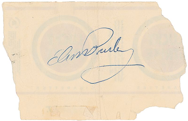 Vintage ballpoint signature, “Elvis Presley,” on the reverse of an off-white 5 x 3.5 piece of a Lucky Strike cigarette label. Two vertical creases passing through signature, irregular edges, light show-through from logos on reverse, and light overall creasing and wrinkling, otherwise very good condition.