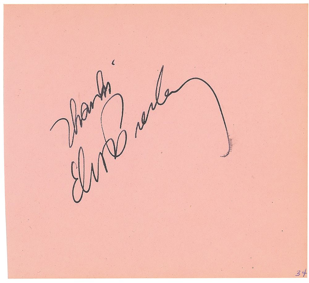 Bold ink signature, “Thanks, Elvis Presley,” on a light pink 5 x 4.5 album page. In fine condition, with a bit of trivial edge toning and a slight brush to last letter of signature.