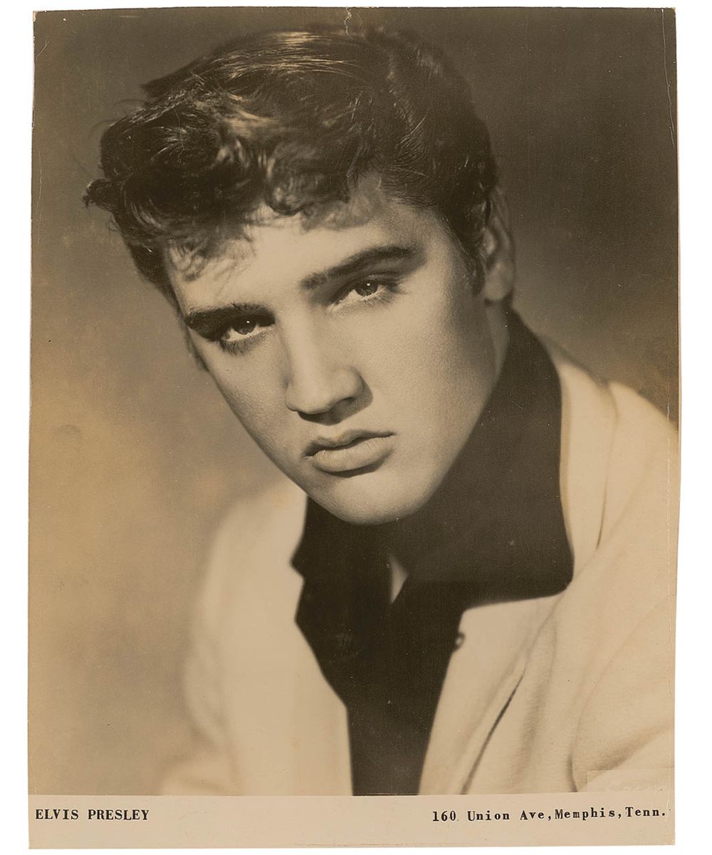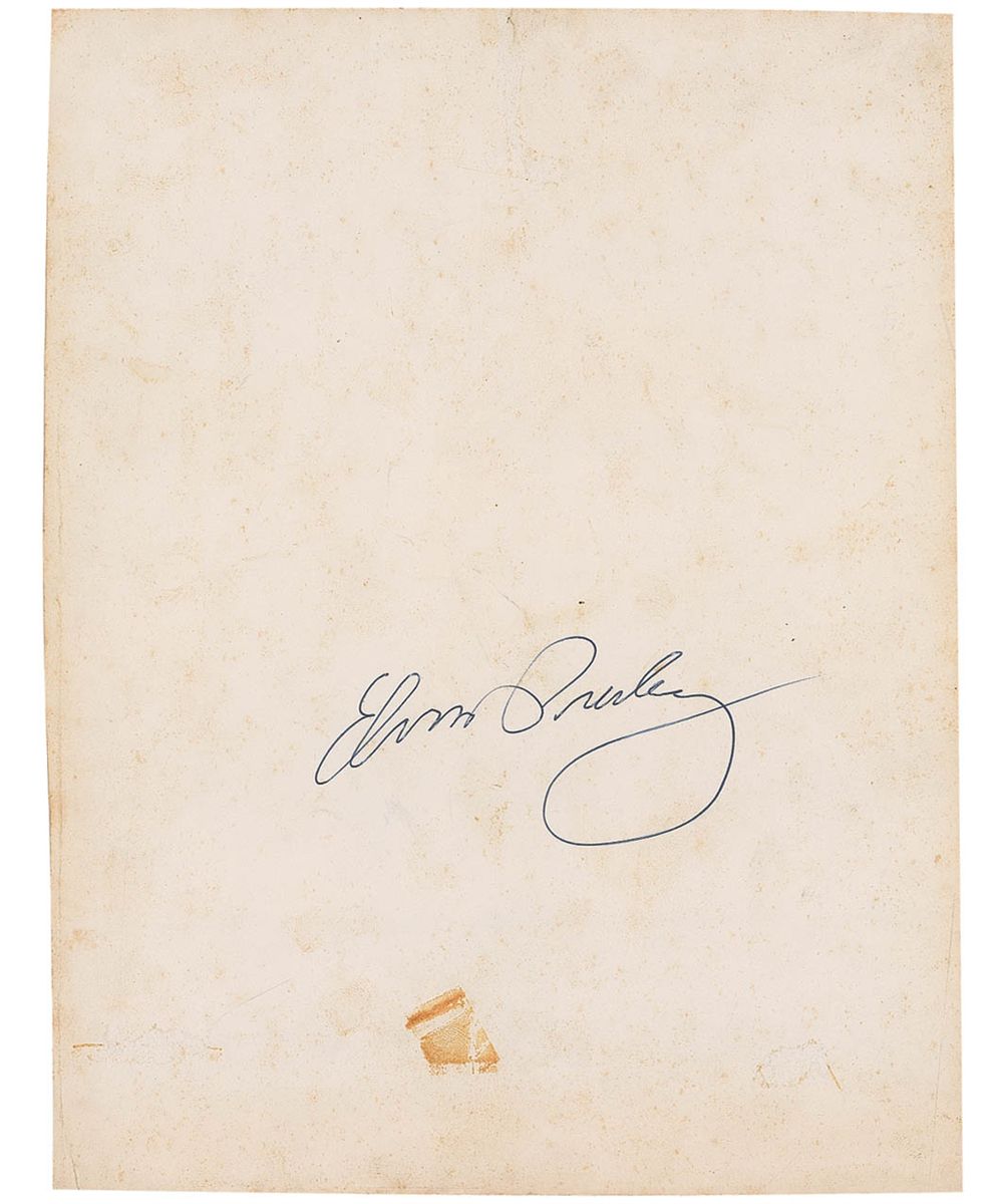Handsome vintage glossy 7.25 x 9.5 photo of Elvis in a black shirt and white jacket, nicely signed on the reverse in black ballpoint, “Elvis Presley.” In very good condition, with scattered toning and soiling, a bit of minor surface loss and tape toning to reverse; and scattered creases, surface impressions and spots to image side, as well as trimmed edges.