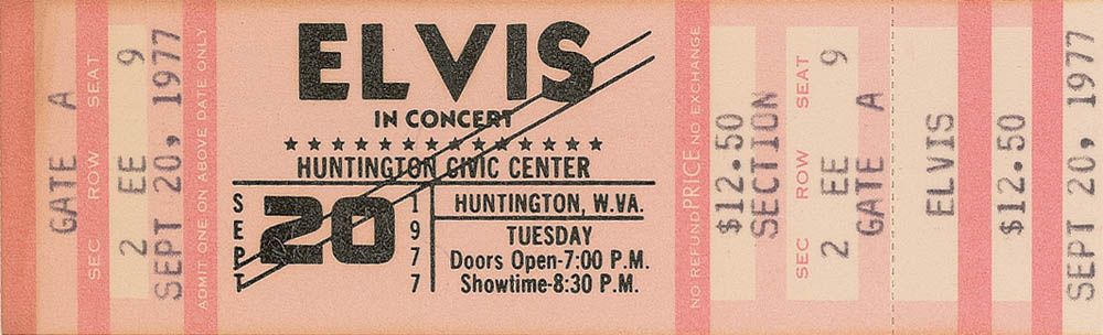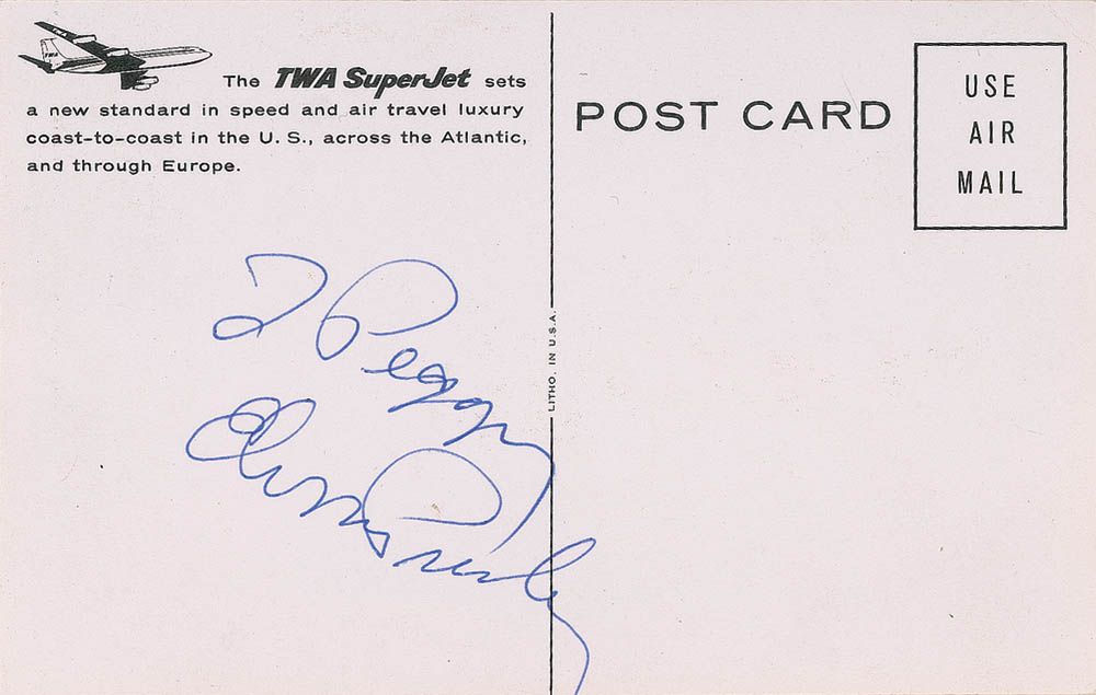 Color 5.5 x 3.25 TWA postcard, signed and inscribed on the reverse in blue ballpoint, “To Peggy, Elvis Presley.” In fine condition, with a small corner tip crease. Accompanied by a letter of authenticity from James Spence as well as an unused ticket from Presley’s scheduled September 20, 1977 concert at the Huntington Civic Center in Huntington, West Virginia.