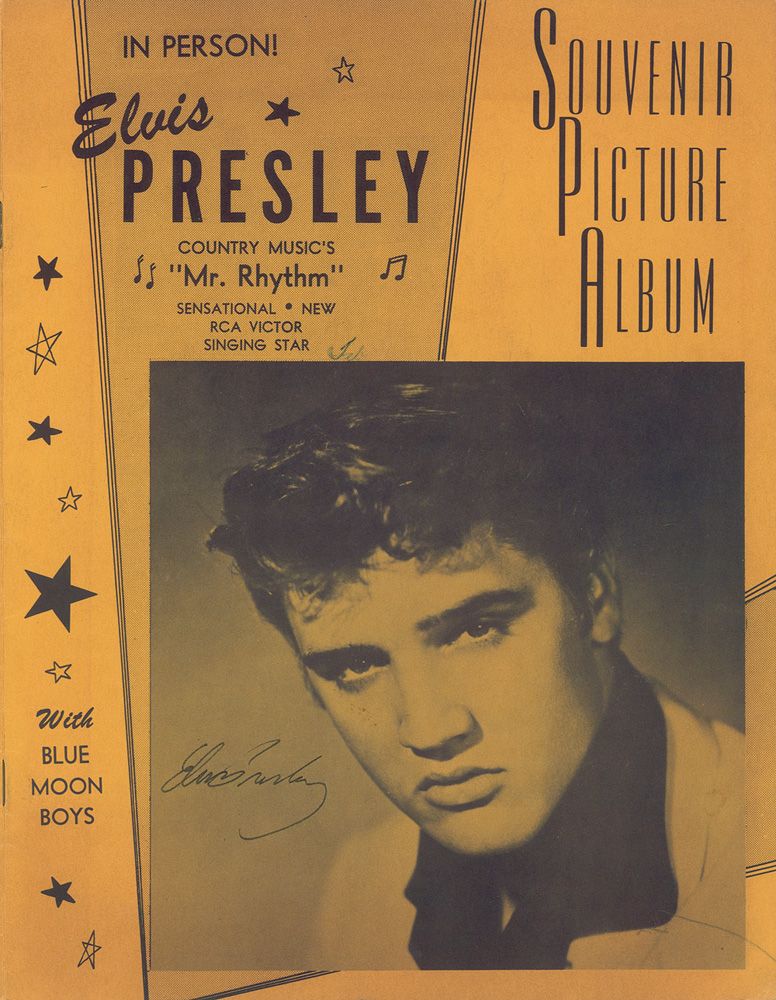 Souvenir picture album promoting Elvis Presley with the Blue Moon Boys, 8.5 x 11, signed twice in black ink by Presley, once on the front cover and once on the back cover, both of which bear his image. In fine condition, with light scattered toning. Accompanied by a full letter of authenticity from Roger Epperson/REAL. Program was signed on February 12, 1956, the day after Elvis performed his RCA Records debut single, 'Heartbreak Hotel,' for the very first time on CBS-TV's 'Stage Show.' After this appearance, his third in as many weeks on The Dorsey Brothers 'Stage Show' program, Presley and his Blue Moon Boys proceeded to Norfolk, Virginia, for a concert the following night at the Monticello Auditorium, the first of five successive dates in Virginia and North Carolina. Prior to the show, a Norfolk policeman, who was on duty working the event, was able to usher his daughter through the crowd for a brief, private encounter with Elvis: the result of that meeting seen on the front of the program. After the performance, however, she waited in line for another meeting and autograph, at which time Elvis signed the back cover of the program. A remarkable piece from a momentous time in Presley's career.