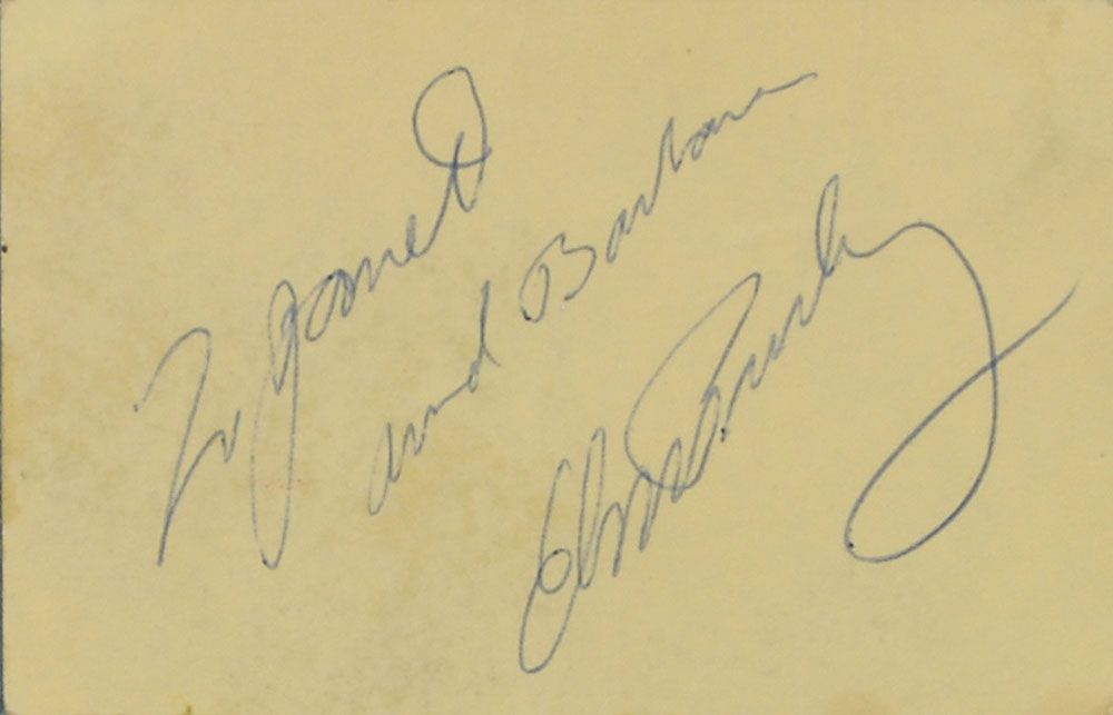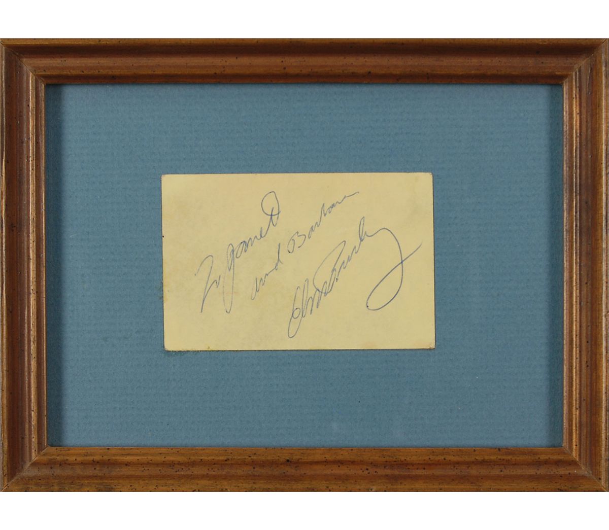 Vintage ballpoint signature and inscription on an off-white 3.5 x 2.25 card. Mounted and framed to an overall size of 7.75 x 5.75. In very good condition, with scattered creases and soiling.