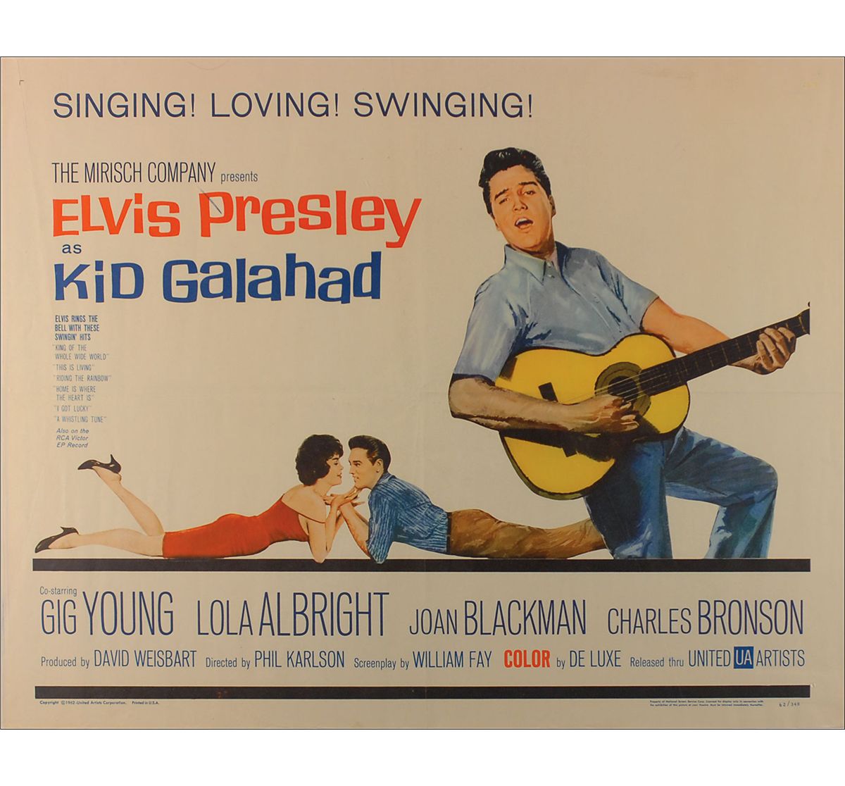 Original color 28 x 22 half-sheet movie poster for the 1962 film Kid Galahad, starring Presley, Gig Young, and Charles Bronson. Central horizontal and vertical fold, some scattered light creases, and a bit of light soiling, otherwise fine condition. Rolled.