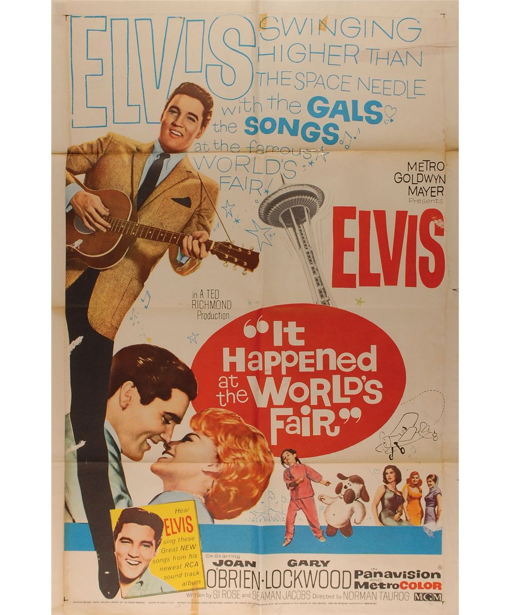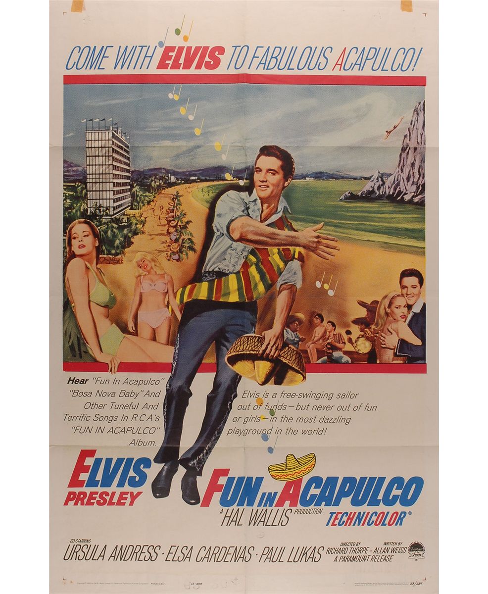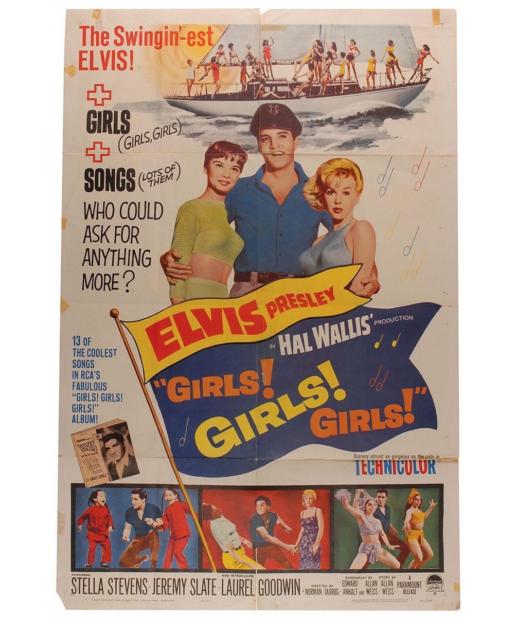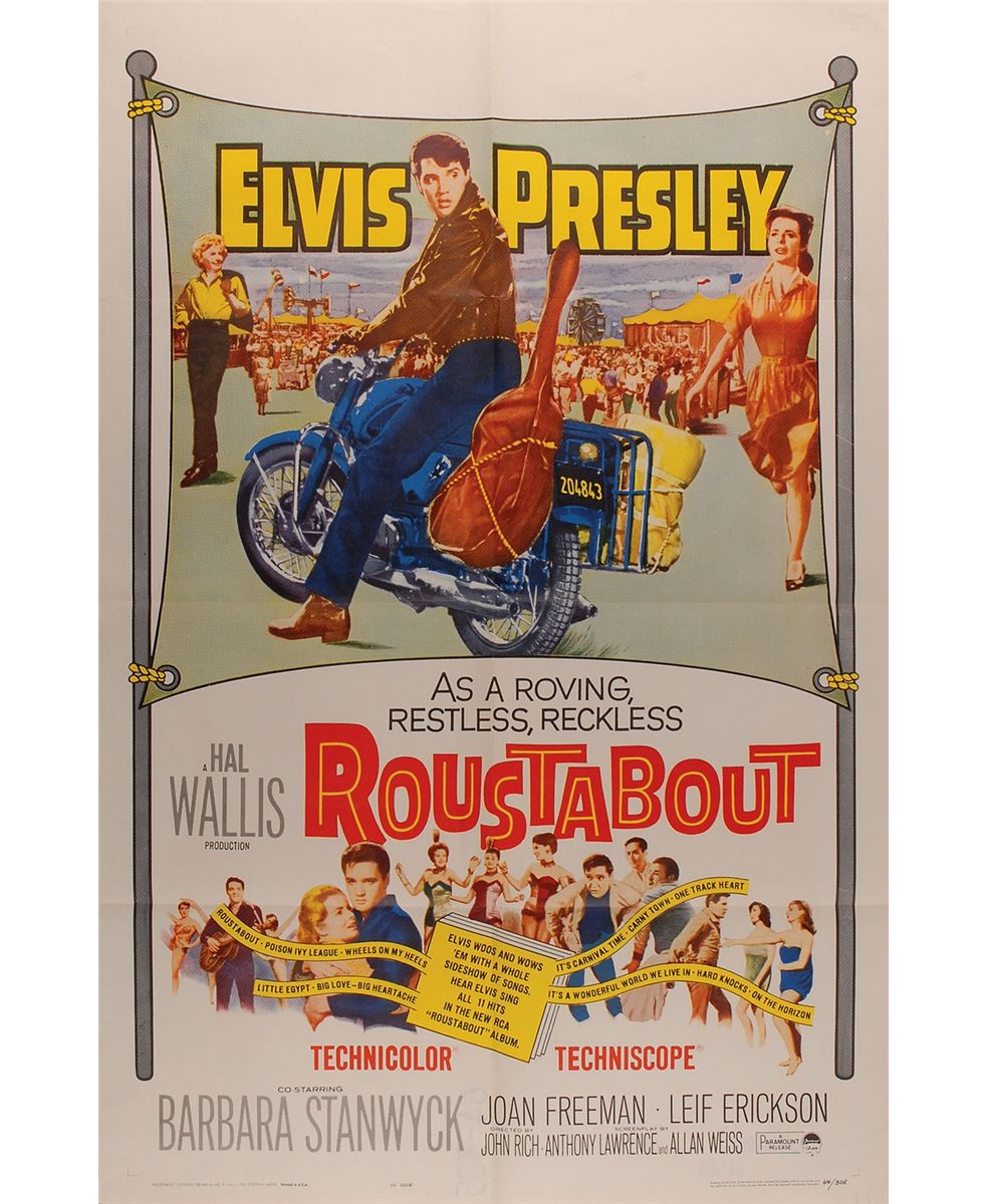 Four color 27 x 41 one-sheet movie posters for films starring Presley: Girls, Girls, Girls (1962), It Happened at the World’s Fair (1963), Fun in Acapulco (1963), and Roustabout (1964). In overall very good to fine condition, with expected intersecting folds, some separations along folds (many repaired with tape), and various scattered light toning and soiling.