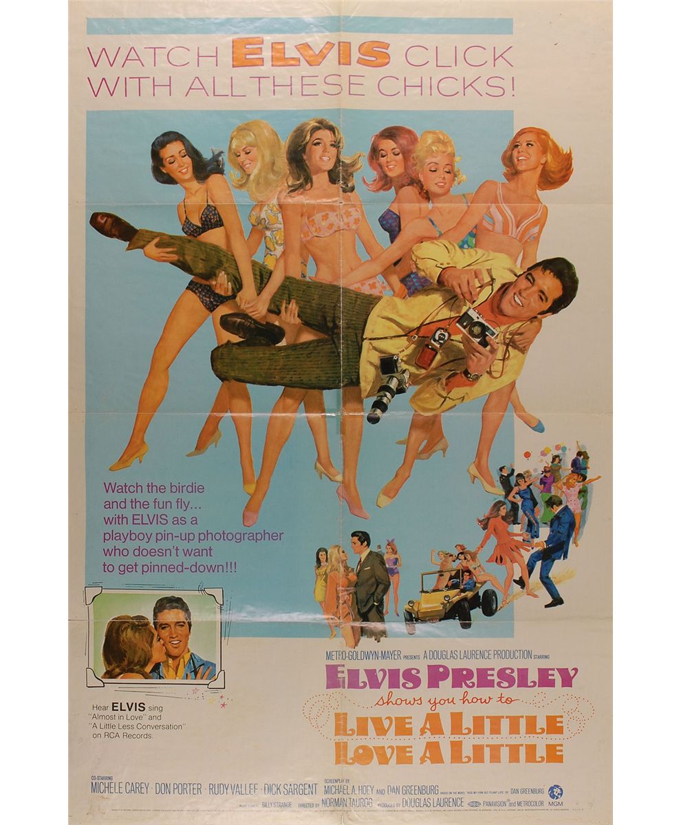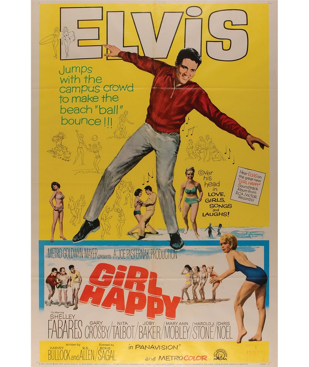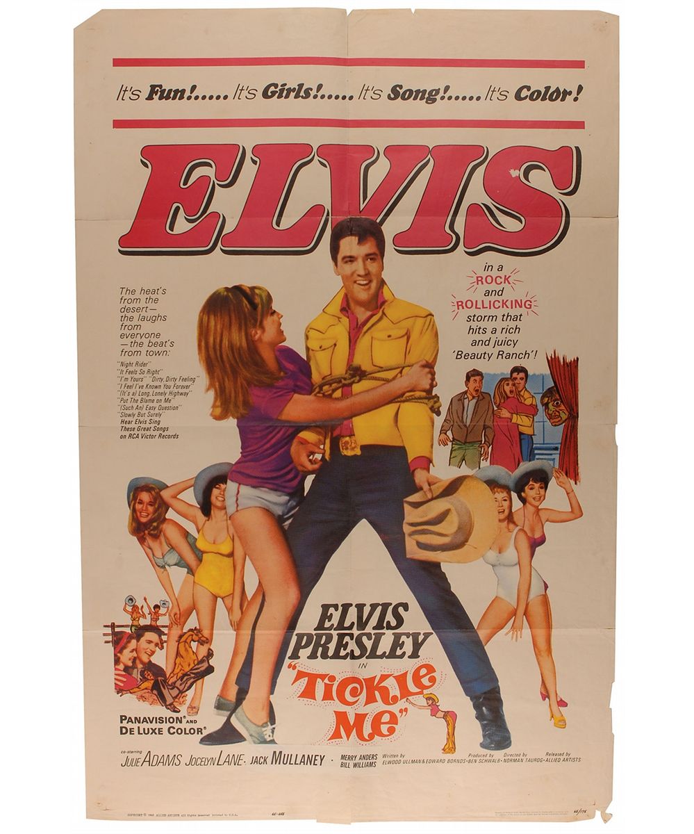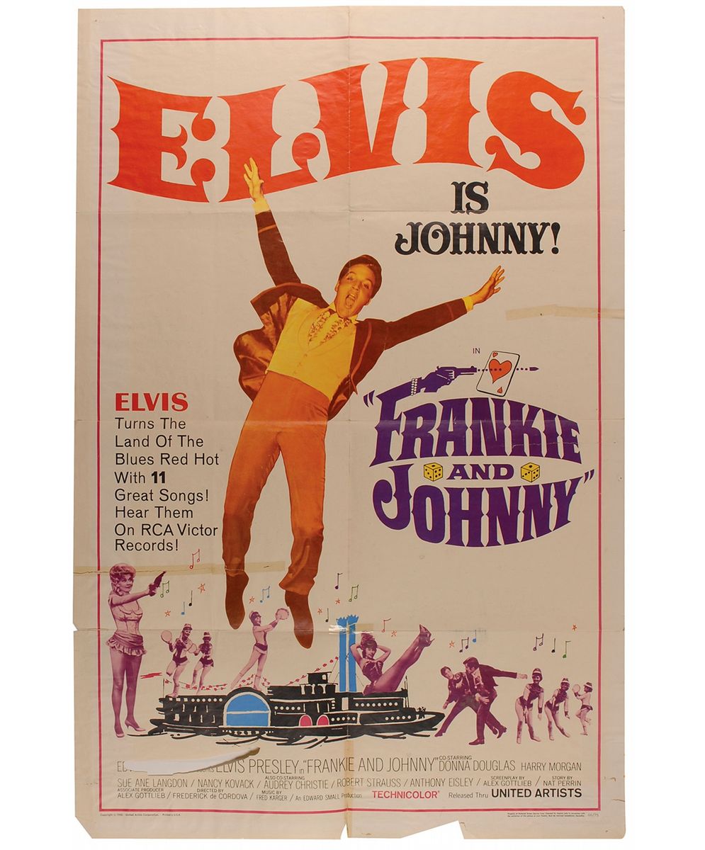 Five color 27 x 41 one-sheet movie posters for films starring Presley: Girl Happy (1965), Tickle Me (1965), Frankie and Johnny (1966), Live a Little, Love a Little (1968), and Charro (1969). In overall very good to fine condition, with expected intersecting folds, some separations along folds (many repaired with tape), various scattered light toning and soiling, and some paper loss to the lower portion of the Frankie and Johnny poster.