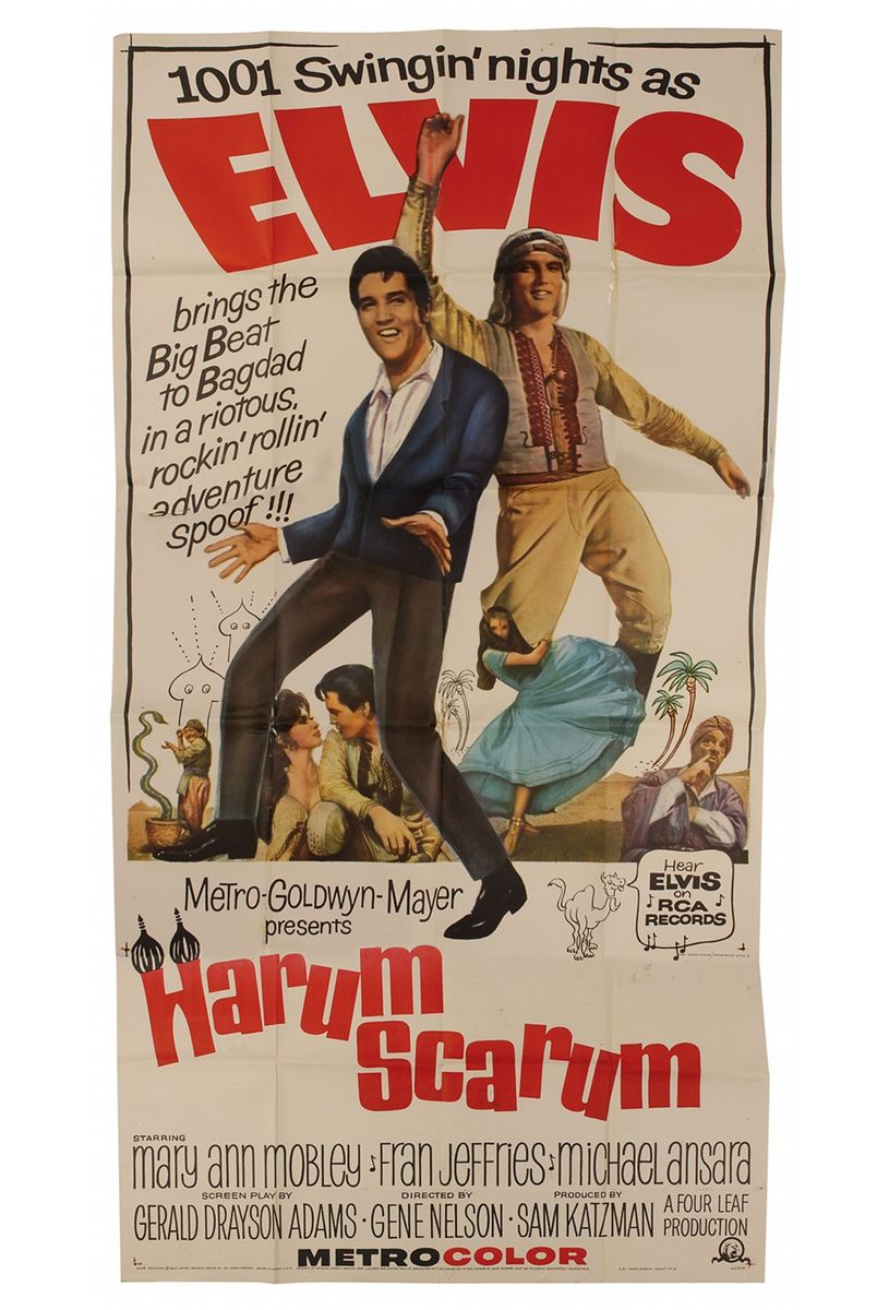 Original color 41 x 81 three-sheet movie poster for the 1965 film Harum Scarum, starring Elvis Presley and Mary Ann Mobley. Poster remains in two unattached sections, as issued. In very good condition, with expected intersecting folds, separations along some folds (many reinforced with tape), and small edge chips and tears.