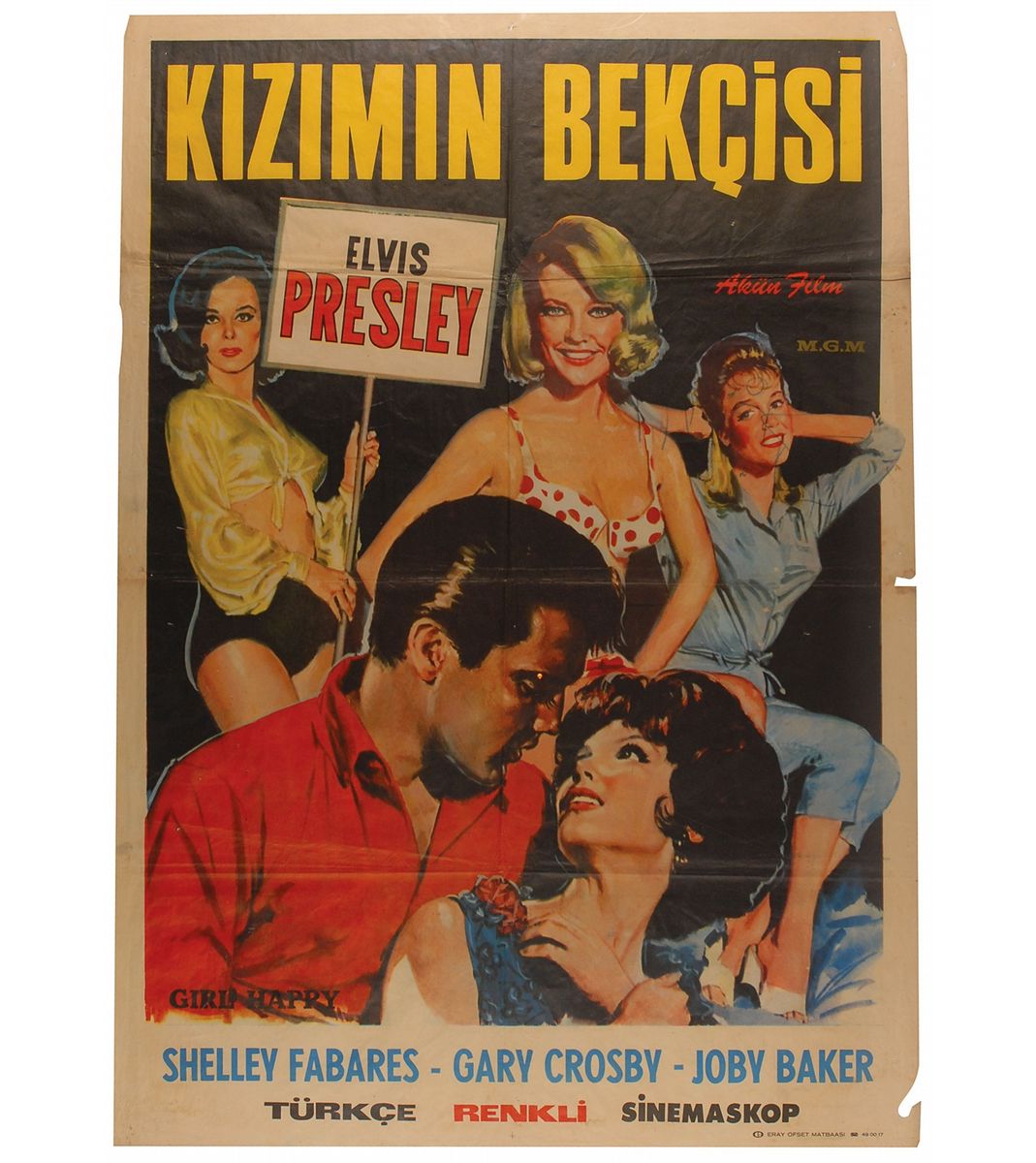 Original Turkish color 27.5 x 39 one-sheet movie poster for the 1965 film Kizimin Bekcisi (Girl Happy), starring Elvis Presley and Shelley Fabares. In very good condition, with some show-through from ink notations to reverse, slight paper loss to right border, tack holes to corners, and small edges chips and tears.