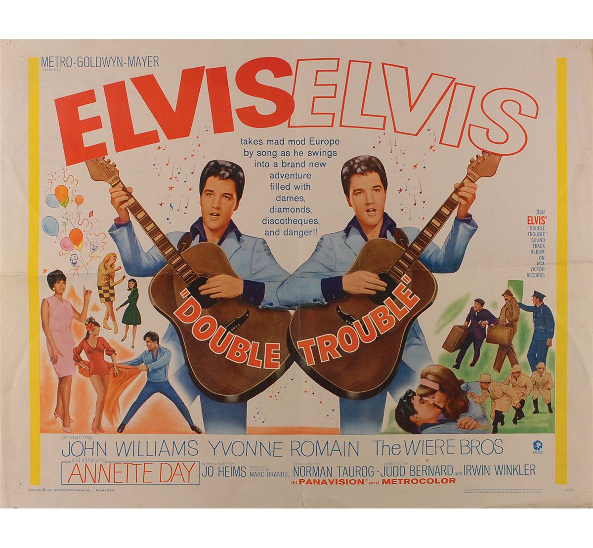 Original color 28 x 22 half-sheet movie poster for the 1967 film Double Trouble, starring Presley and Annette Day. Expected central horizontal and vertical folds, scattered creases, some soiling to borders, and tack holes to corners, otherwise fine condition.