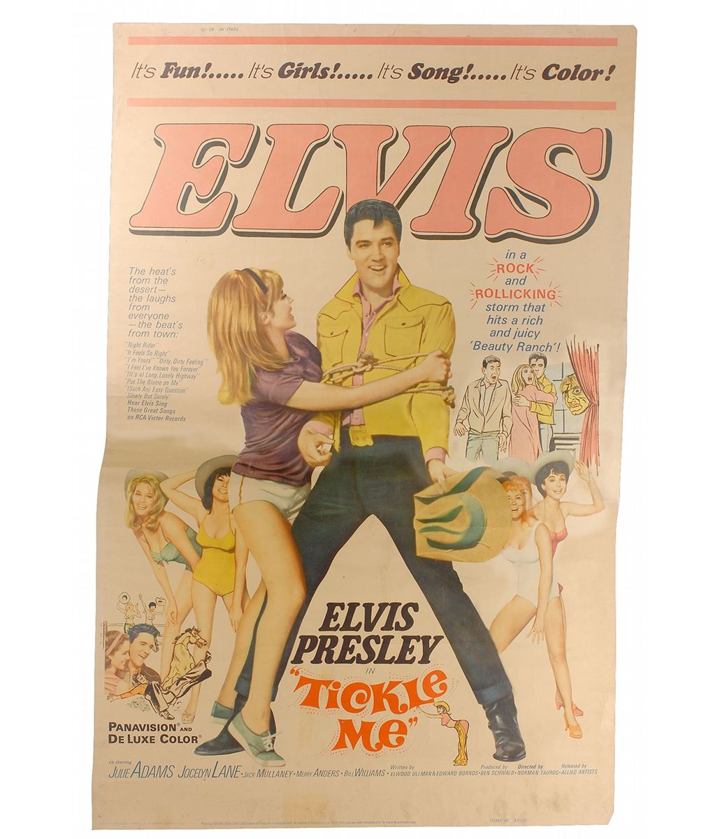 Original color 40 x 60 movie poster for the 1965 film Tickle Me, starring Presley and Julie Adams. Rolled and in very good to fine condition, with moderate scattered creases, tears to top and bottom edges, and a light uniform shade of toning.