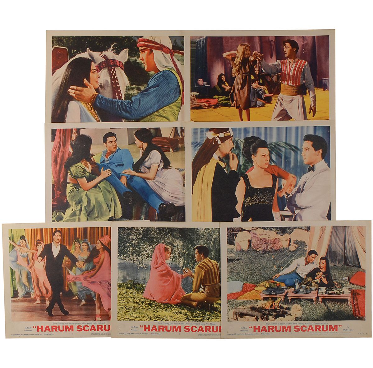 Seven original color 14 x 11 lobby cards for the 1965 MGM film Harum Scarum, starring Elvis Presley and Carolyn Carter. Various scattered tack holes, primarily to corners, and some light creases and soiling, otherwise overall fine condition.